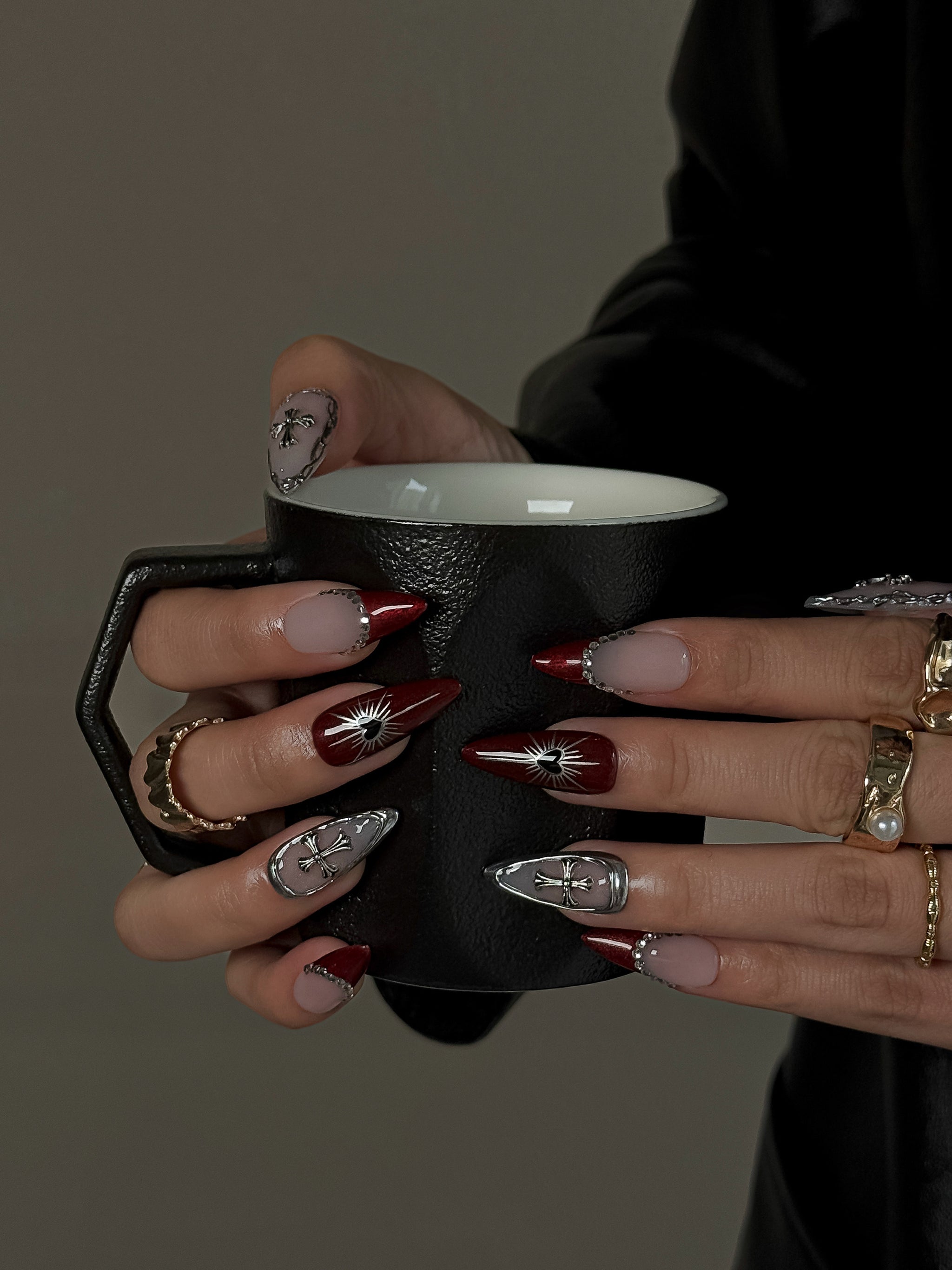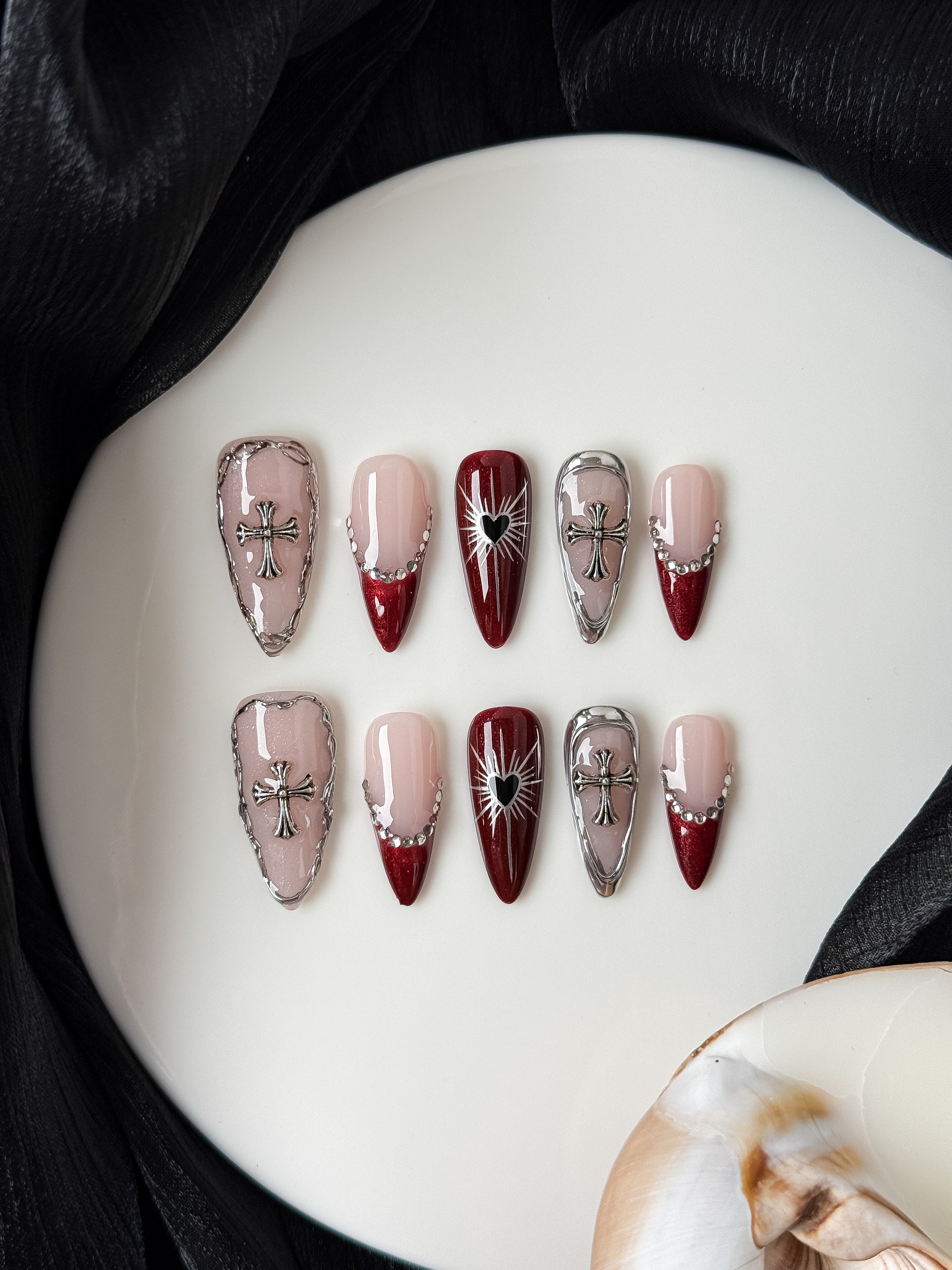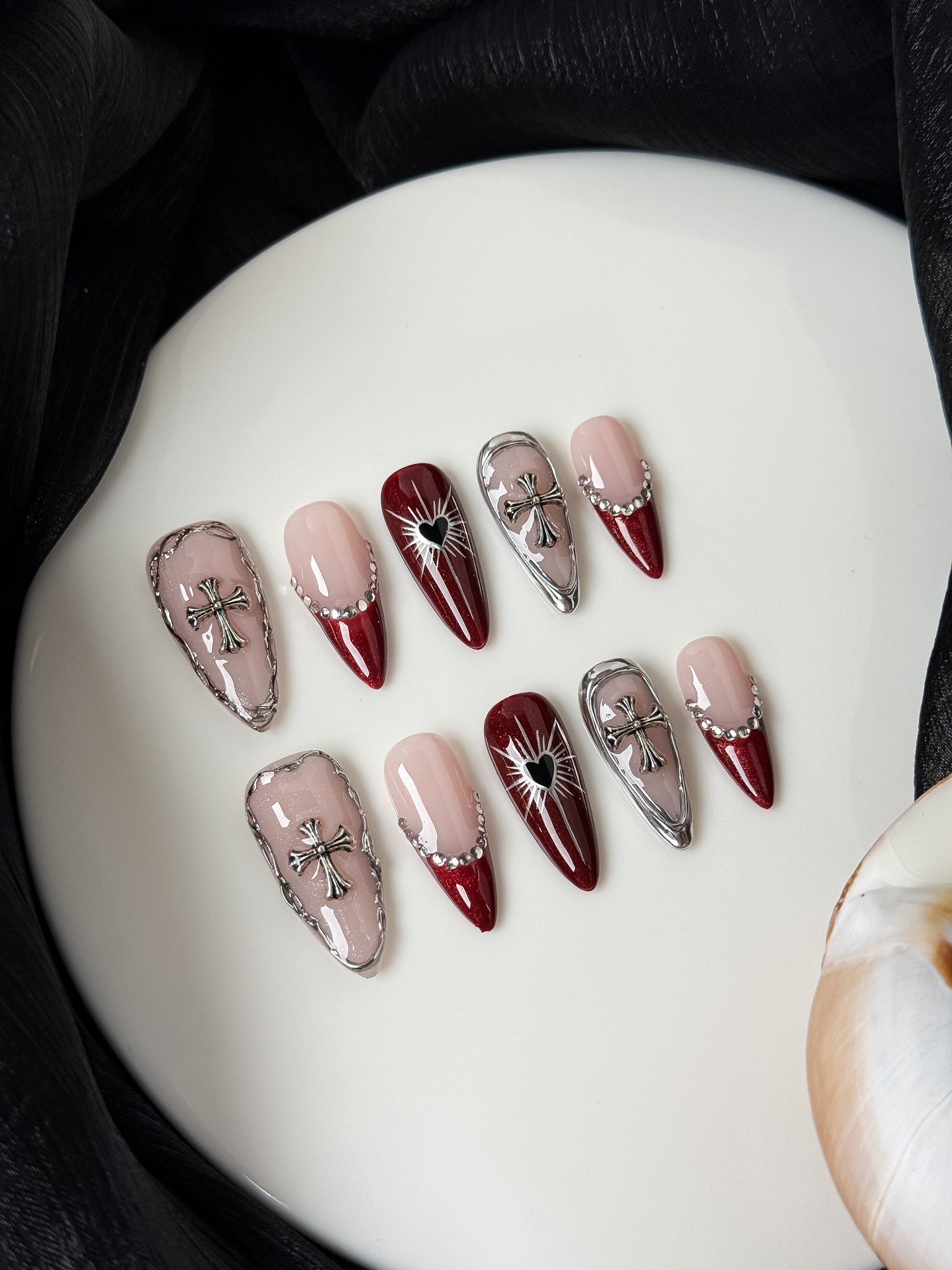 A dramatic deep crimson French set paired with soft nude tones, silver gothic crosses, and sacred heart details.