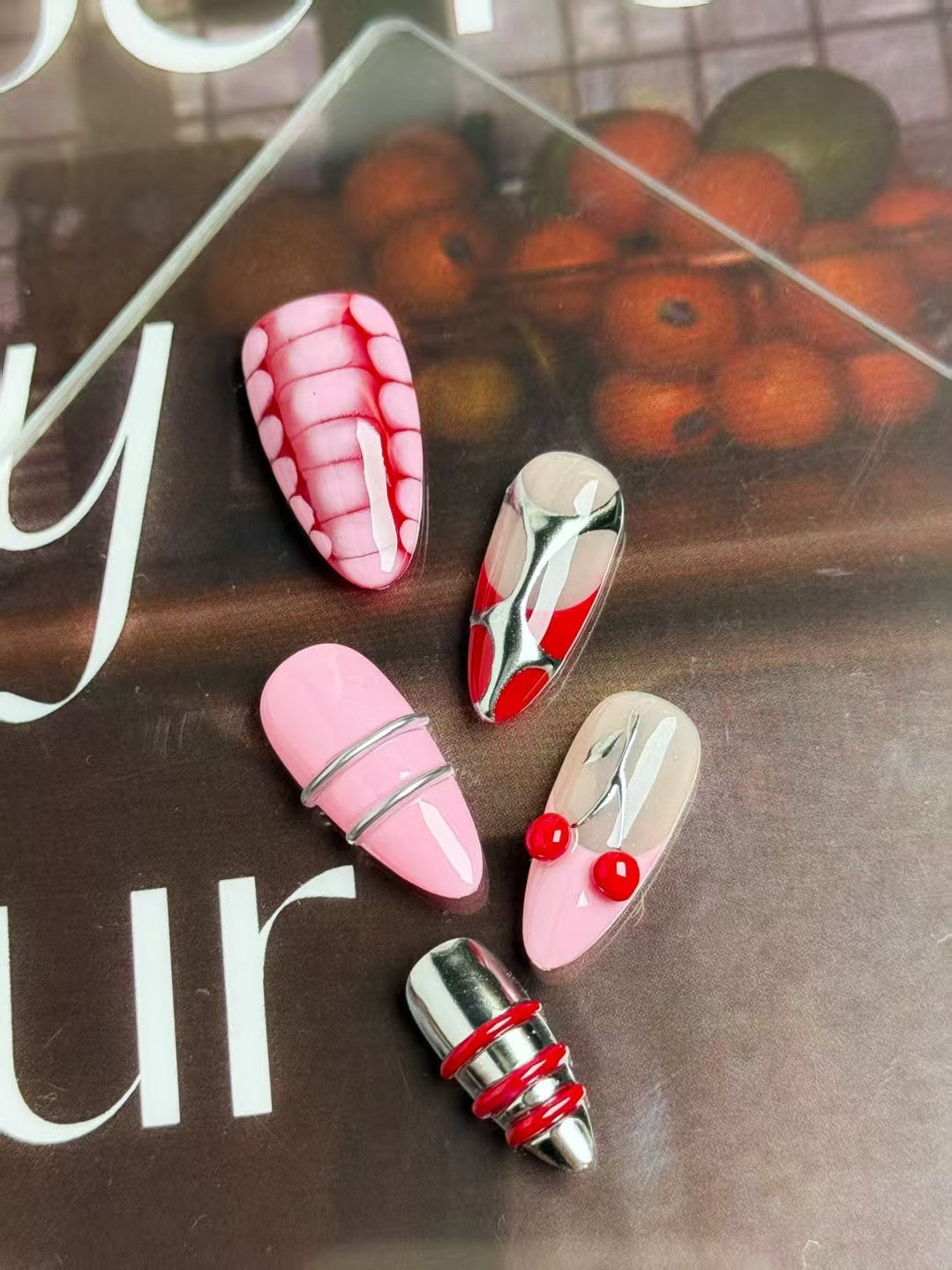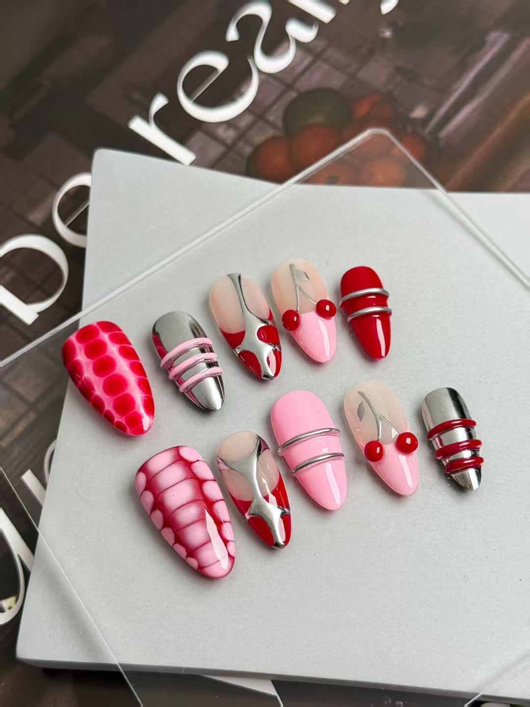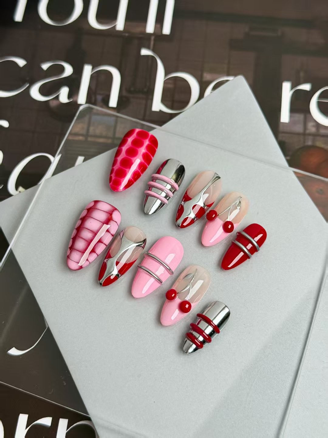 Electrify your style with bold energy. This press-on nail set combines striking red tones, futuristic chrome accents, and daring geometric details. A perfect balance of passion and power, made for those who love to stand out. β‘π