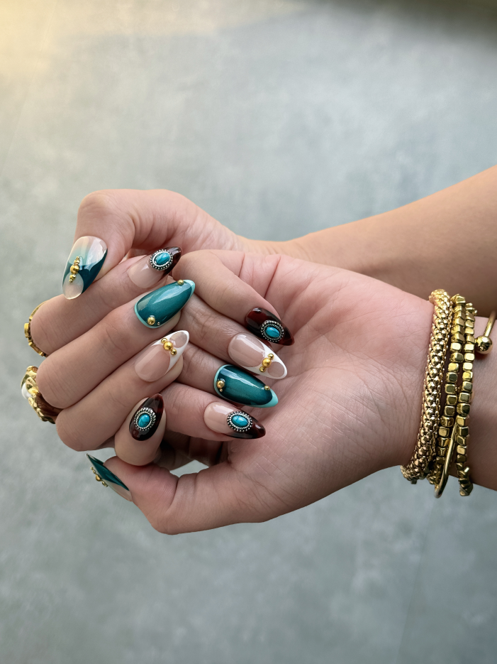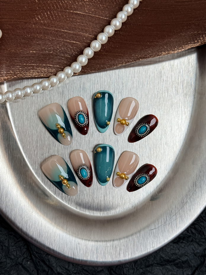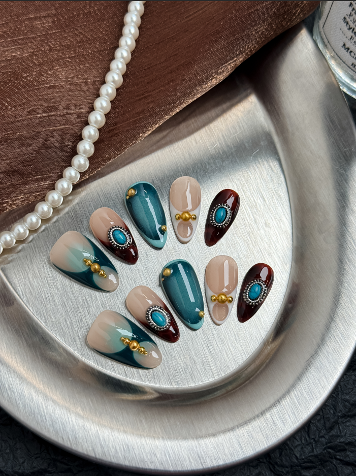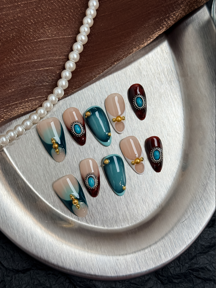Rich emerald and wine tones blend beautifully with nude hues, adorned with turquoise gems and golden accents for a royal finish.