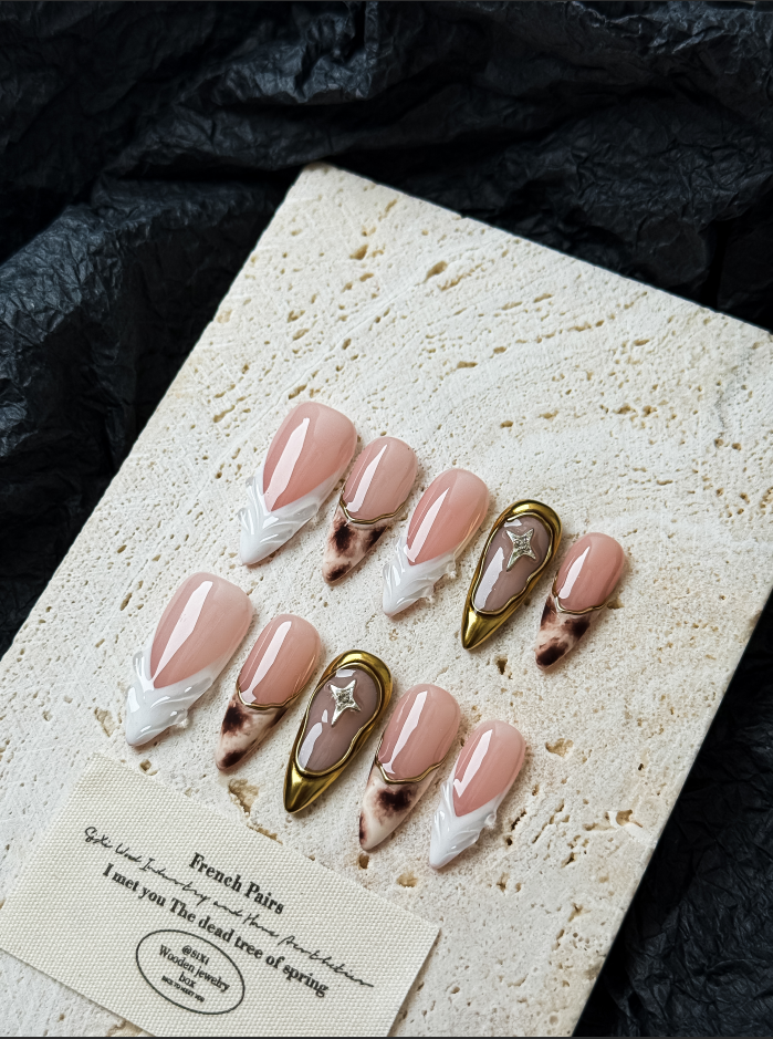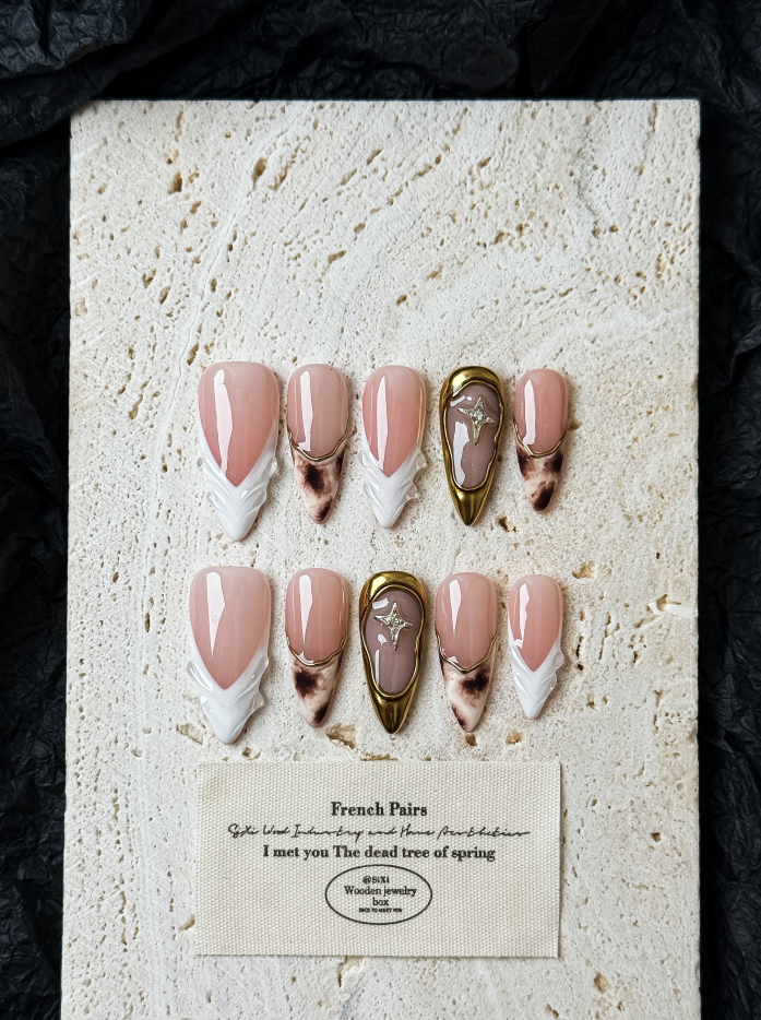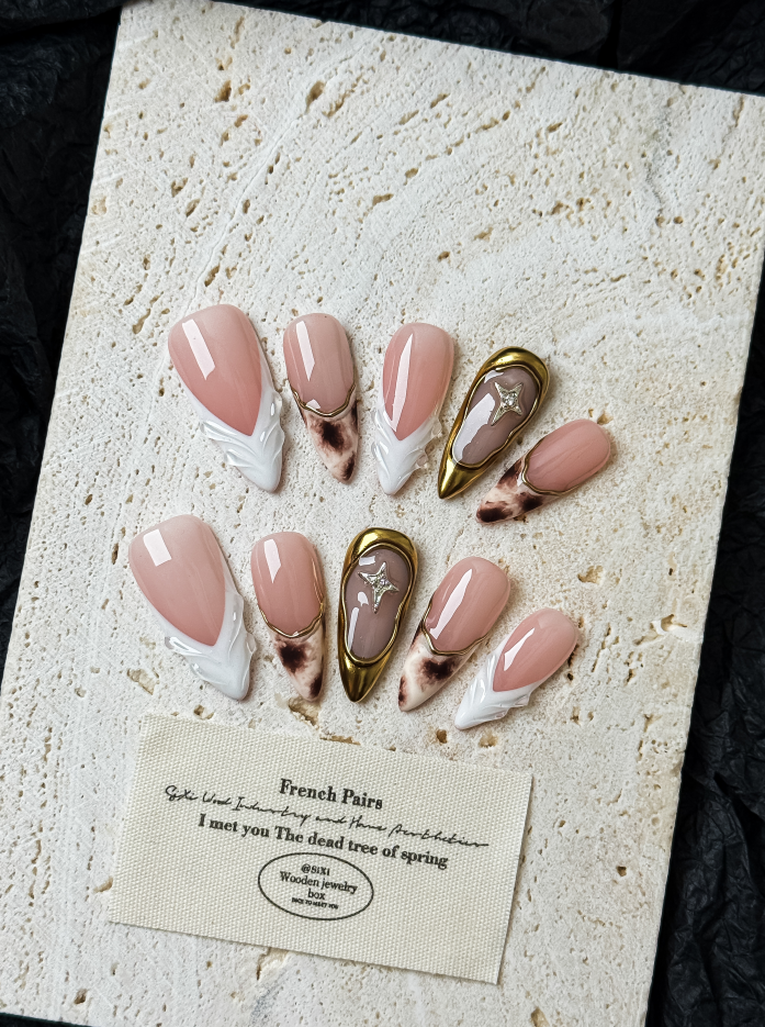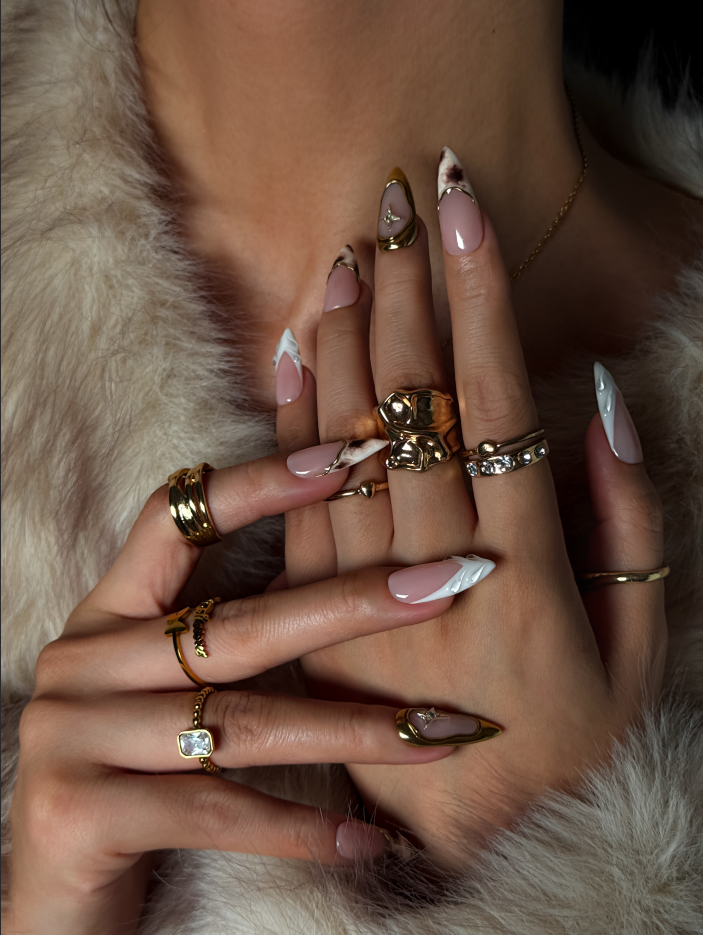 Featuring sculpted white tips, soft marble accents, and a subtle gold star detail, this design blends quiet luxury with artistic elegance.