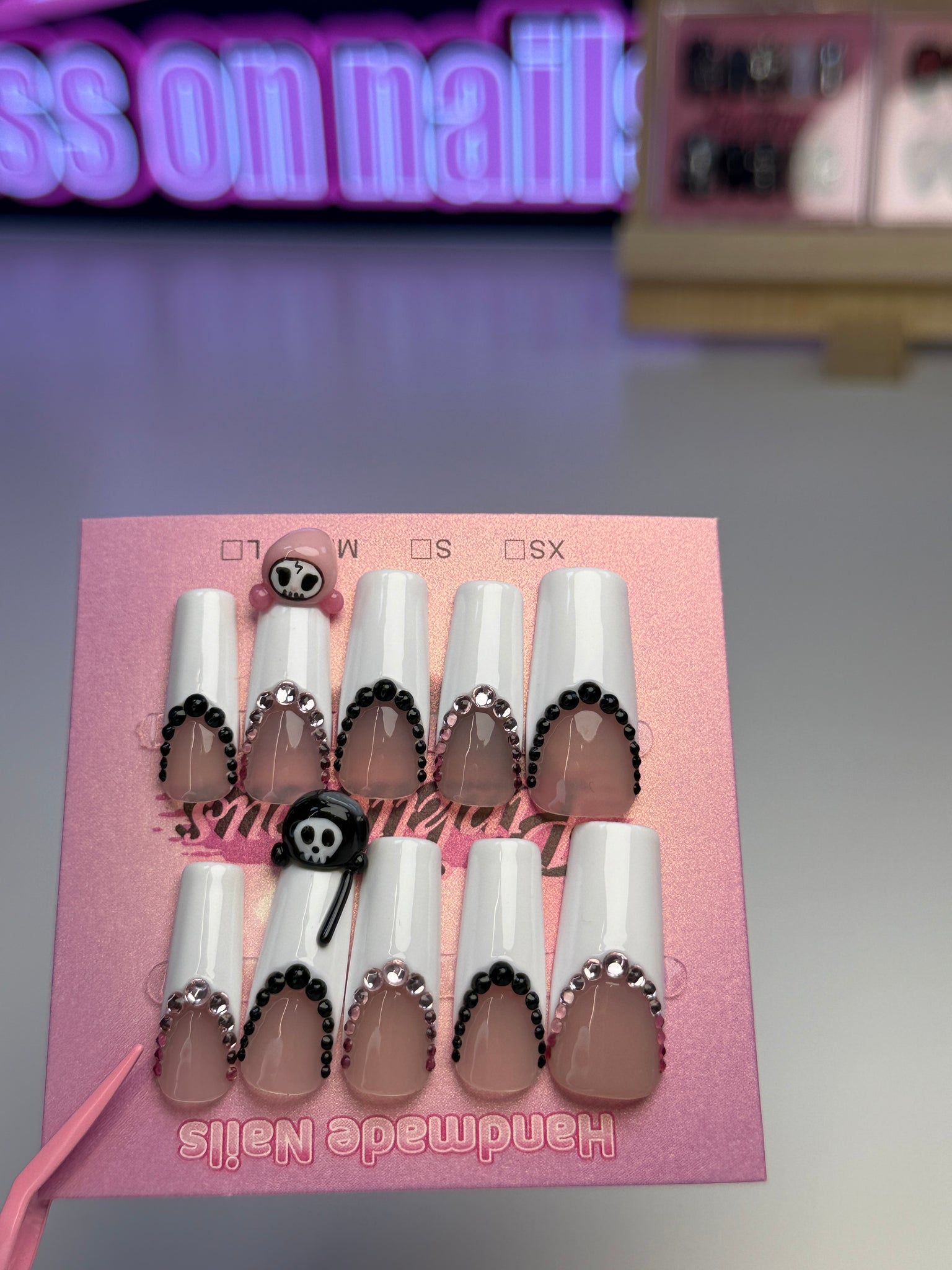 A French-style nail design with white tips framed by black and pink crystals, finished with an adorable skull charm.