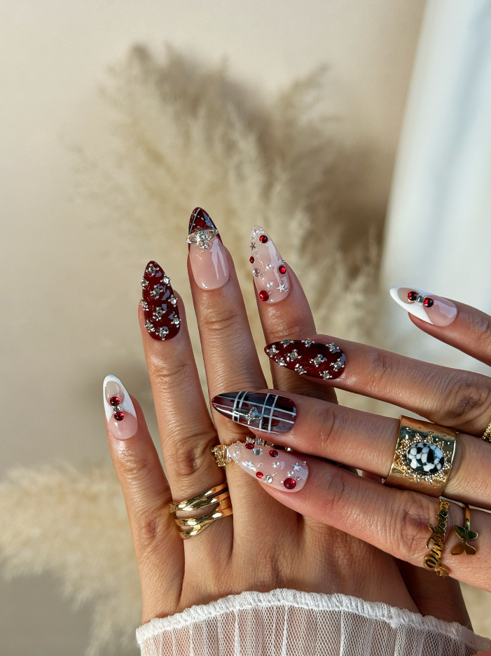 This handcrafted press-on nail set showcases deep wine-red tones, crystal heart accents, intricate plaid details, and lavish rhinestone embellishments, creating a rich, jewel-inspired aesthetic.