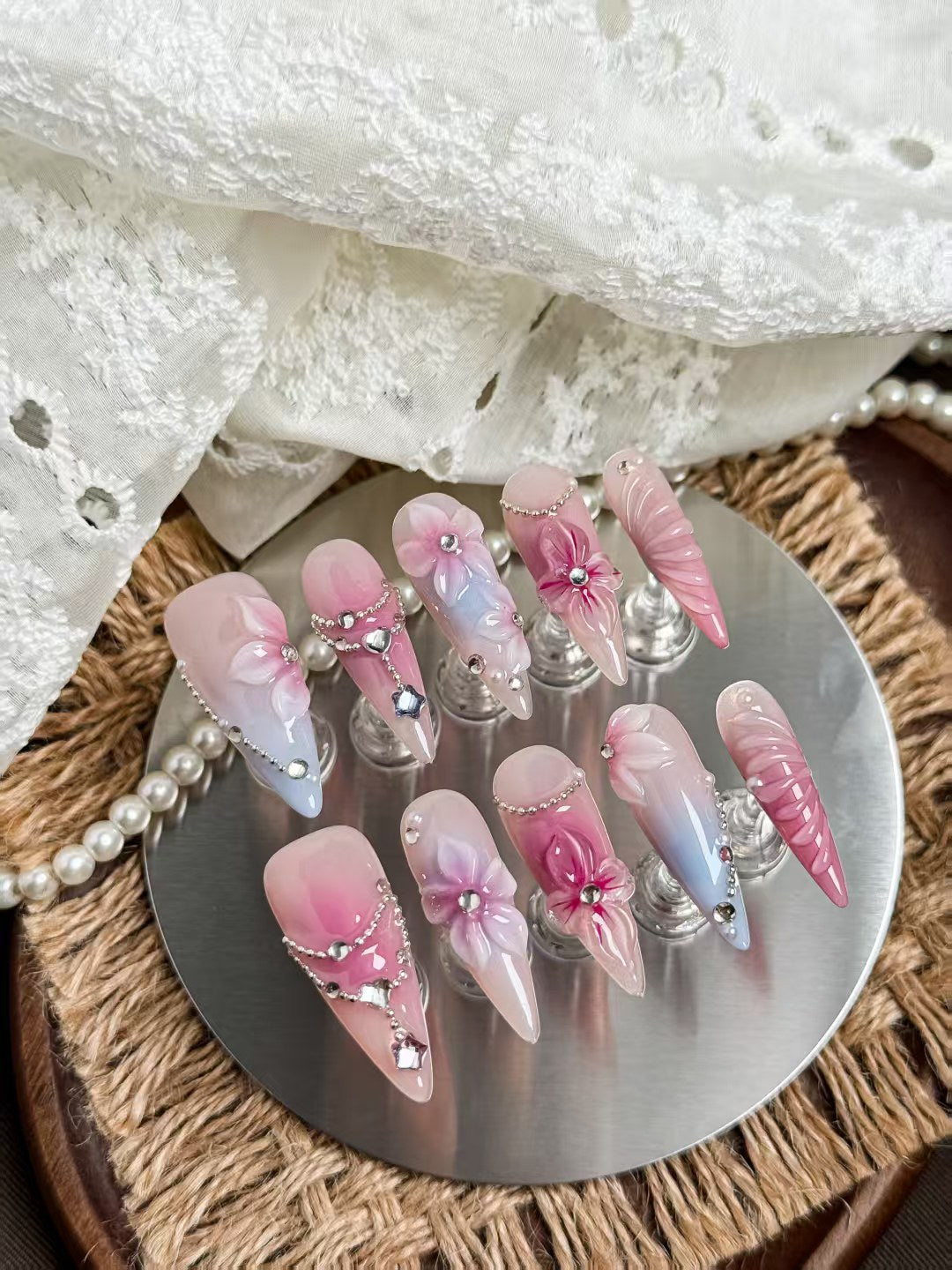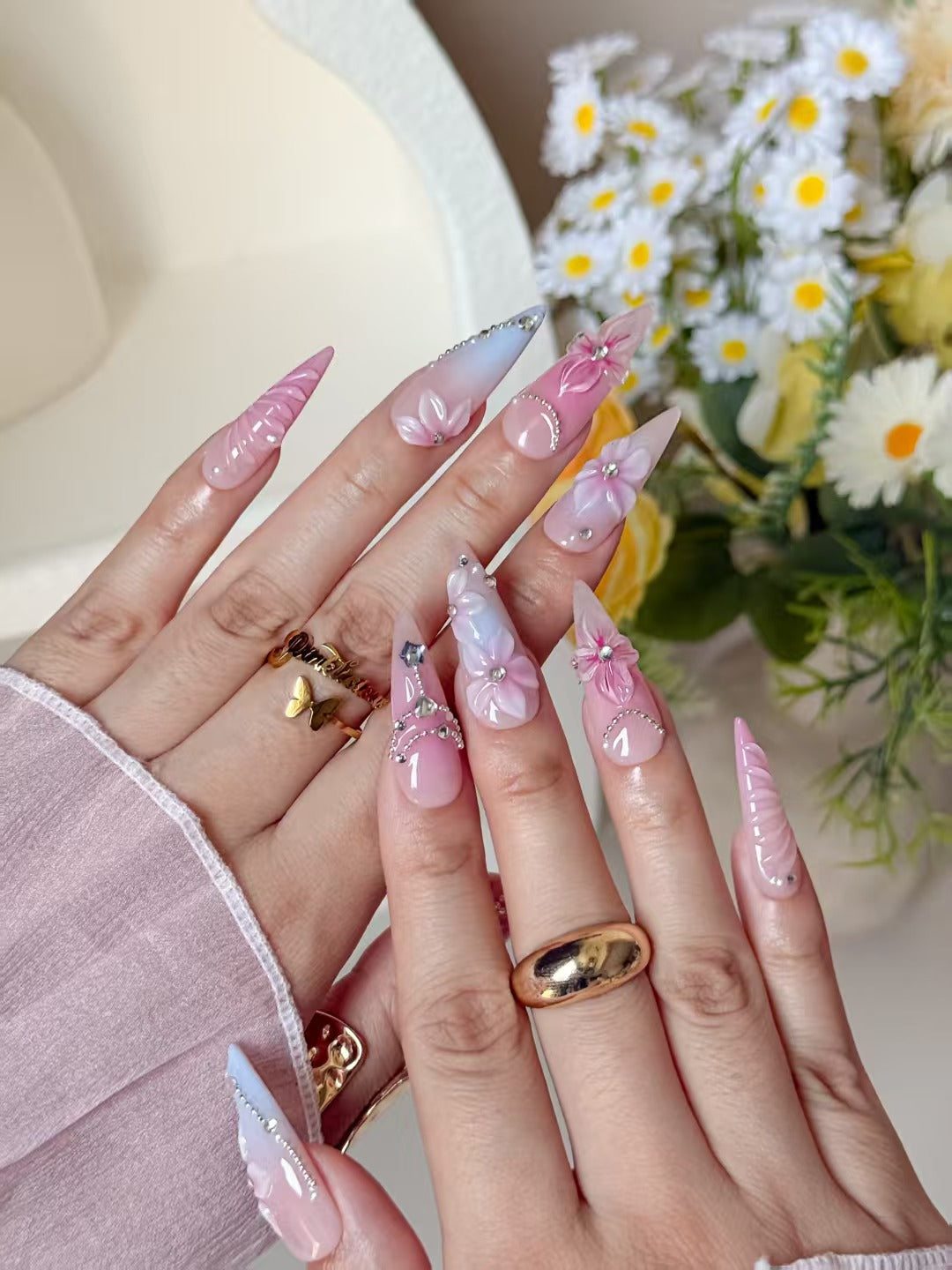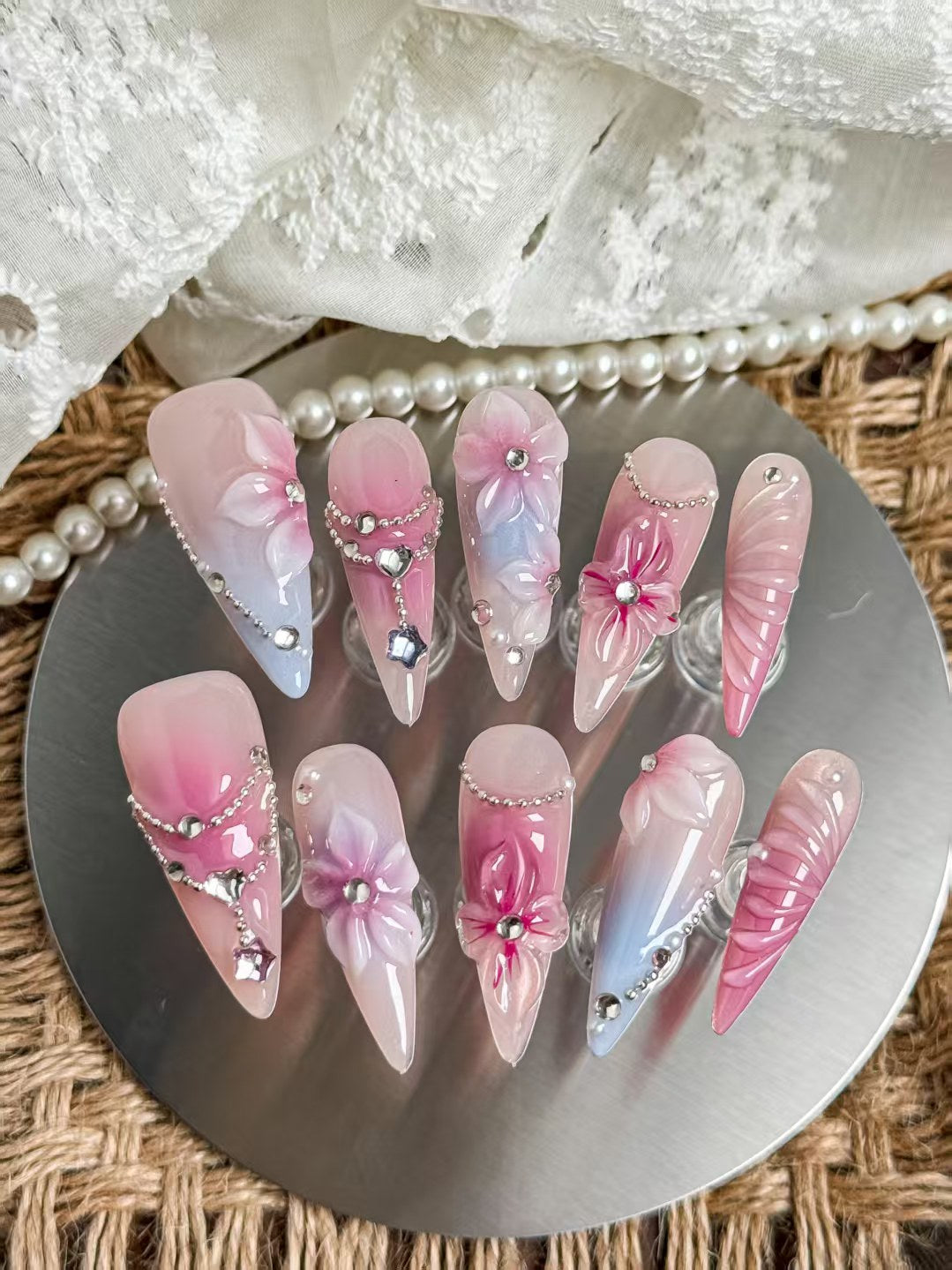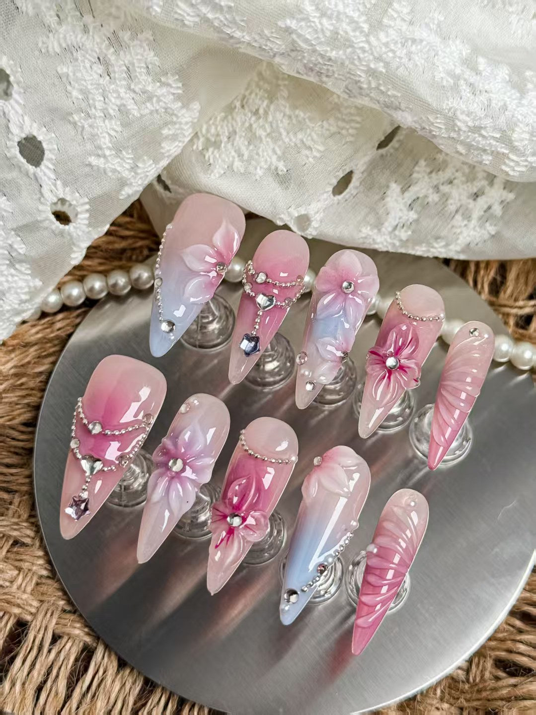 Pastel pink-to-blue gradient base, 3D floral accents, shimmering rhinestones, delicate chain details, and glossy crystal finish.