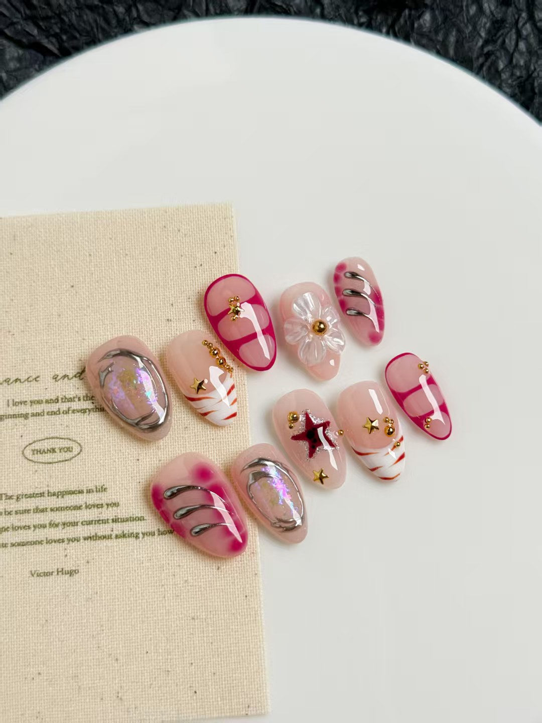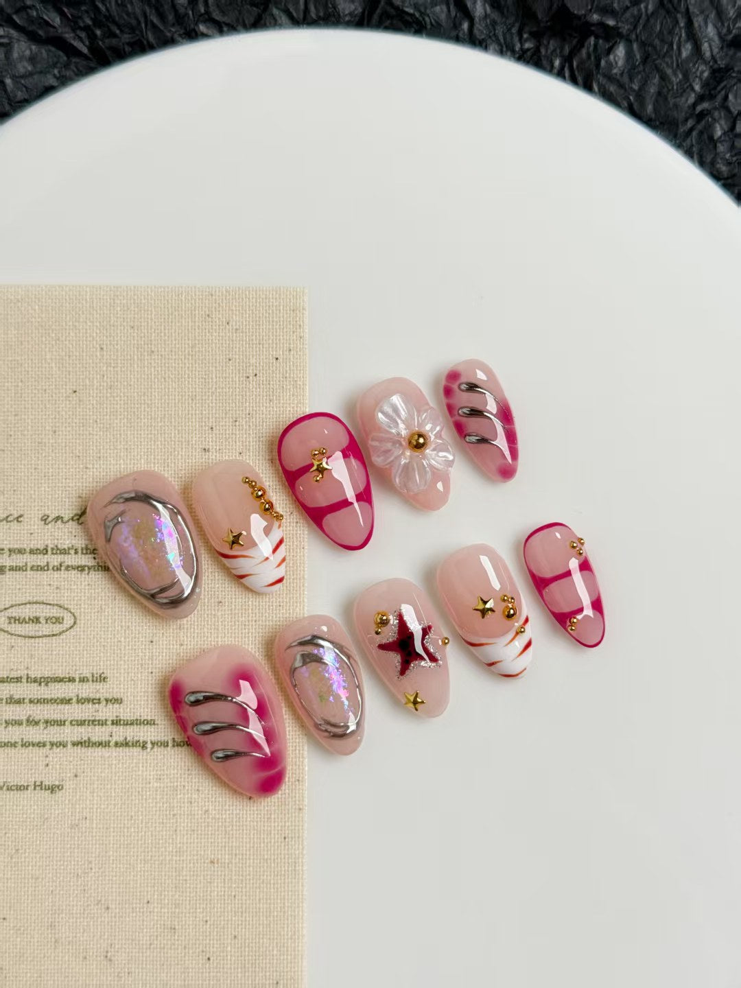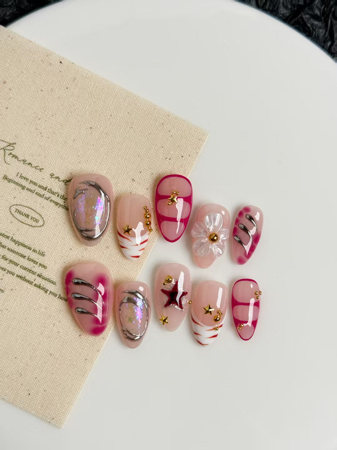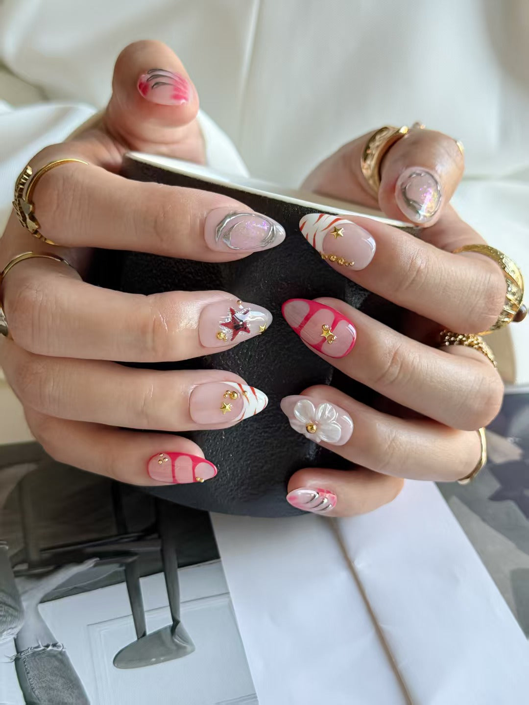 Holographic chrome accents, playful teddy bear charm, bold red outlines, metallic stripes, 3D clear flower, glittering stars, and glossy nude-pink base.