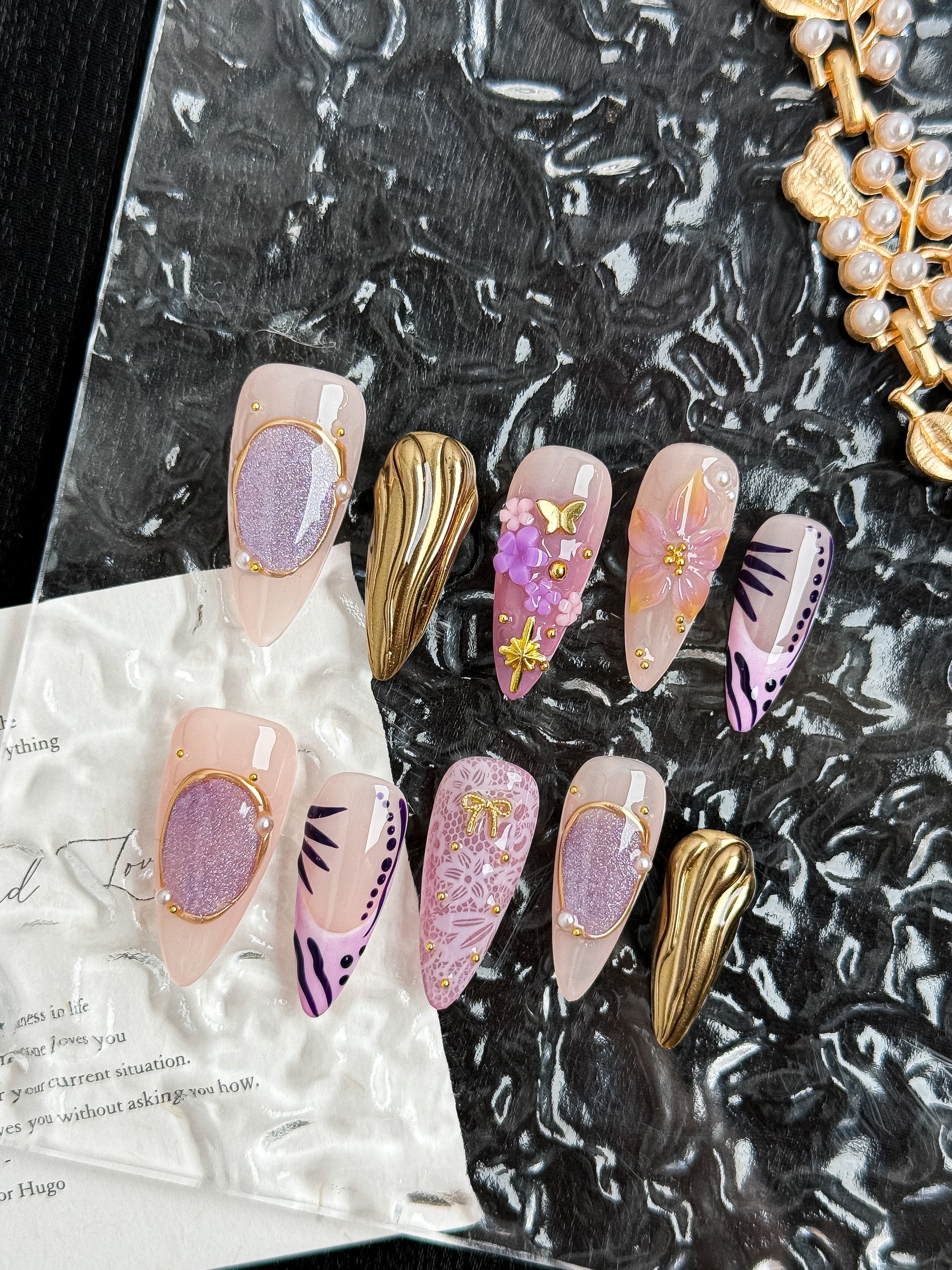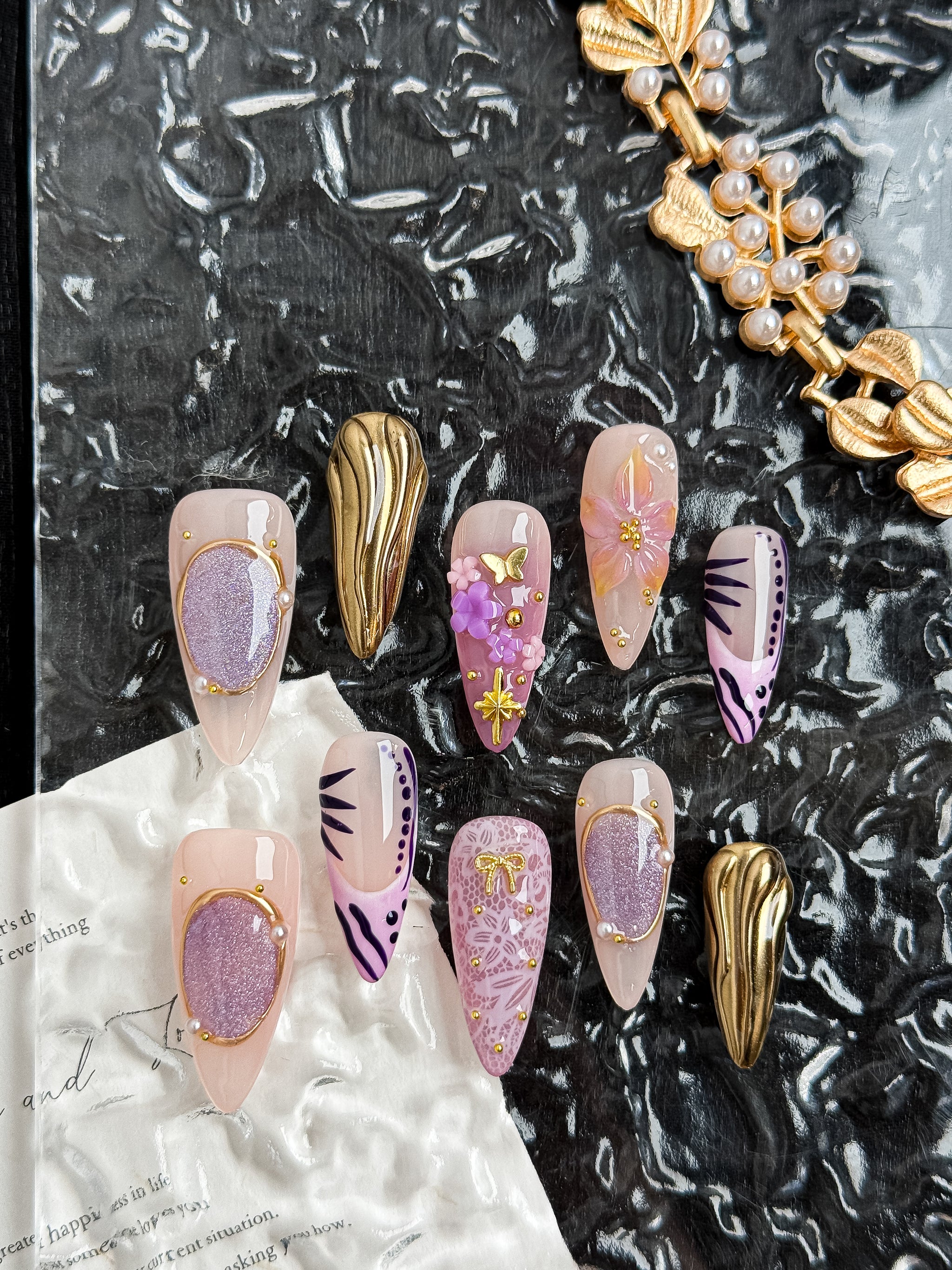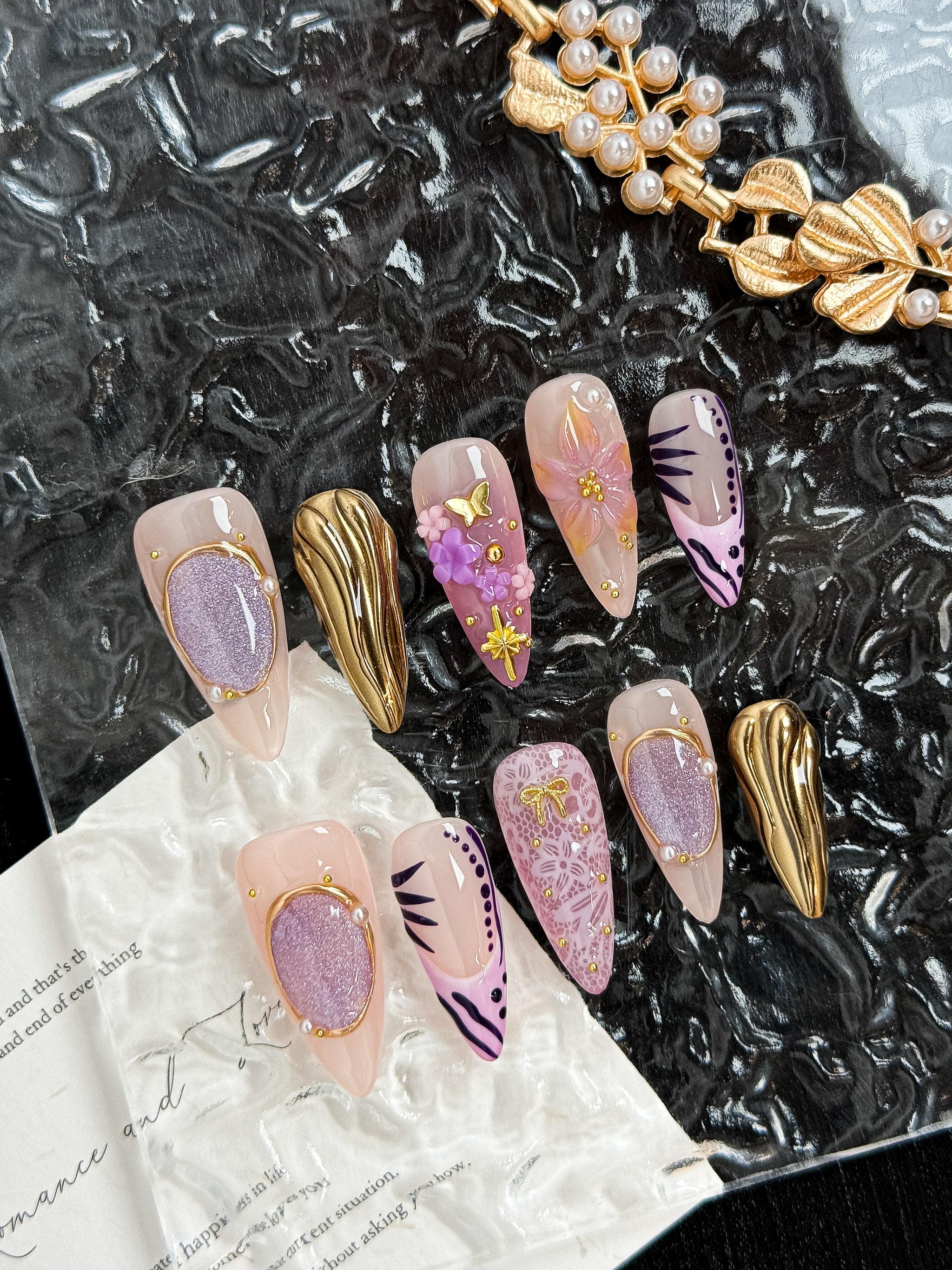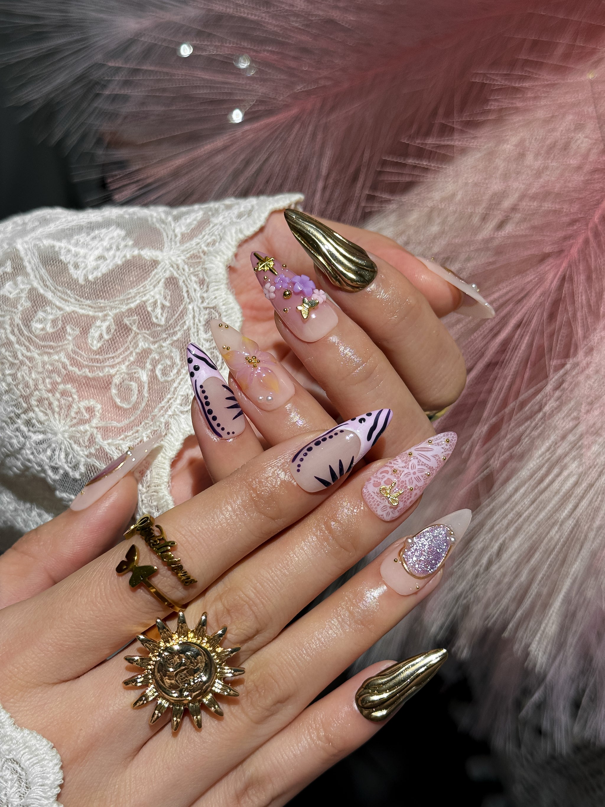 Amethyst Crown is a luxury statement set designed for those who love bold elegance. Featuring soft nude pink bases layered with metallic gold chrome, sculpted 3D florals, delicate butterfly accents, and ornate cross details, this set blends royal glamour with modern femininity.