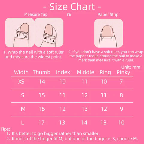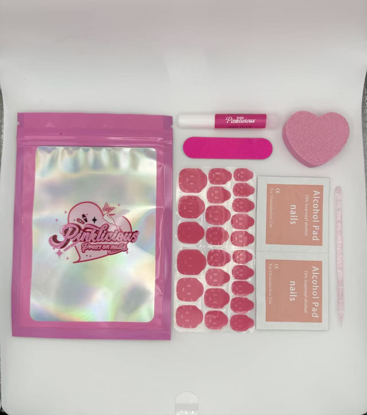 includes :10 pic nail set , sticky pad, crystal stick, pink heat nail file, alcohol pad , nail glue