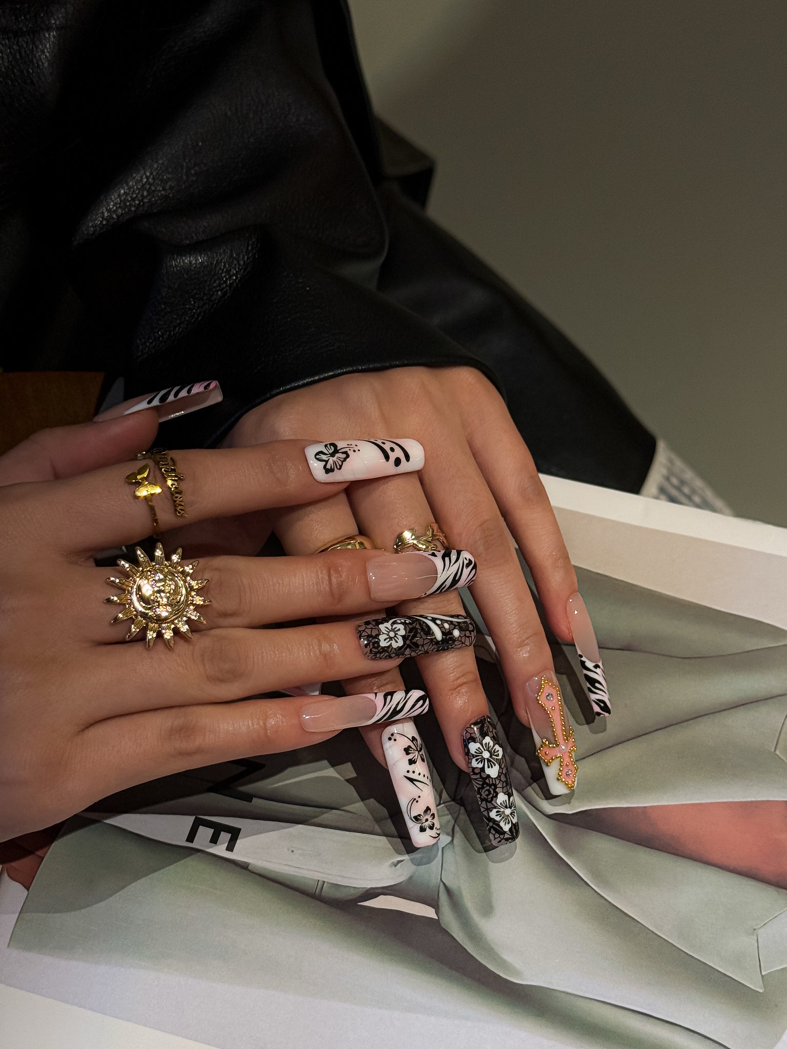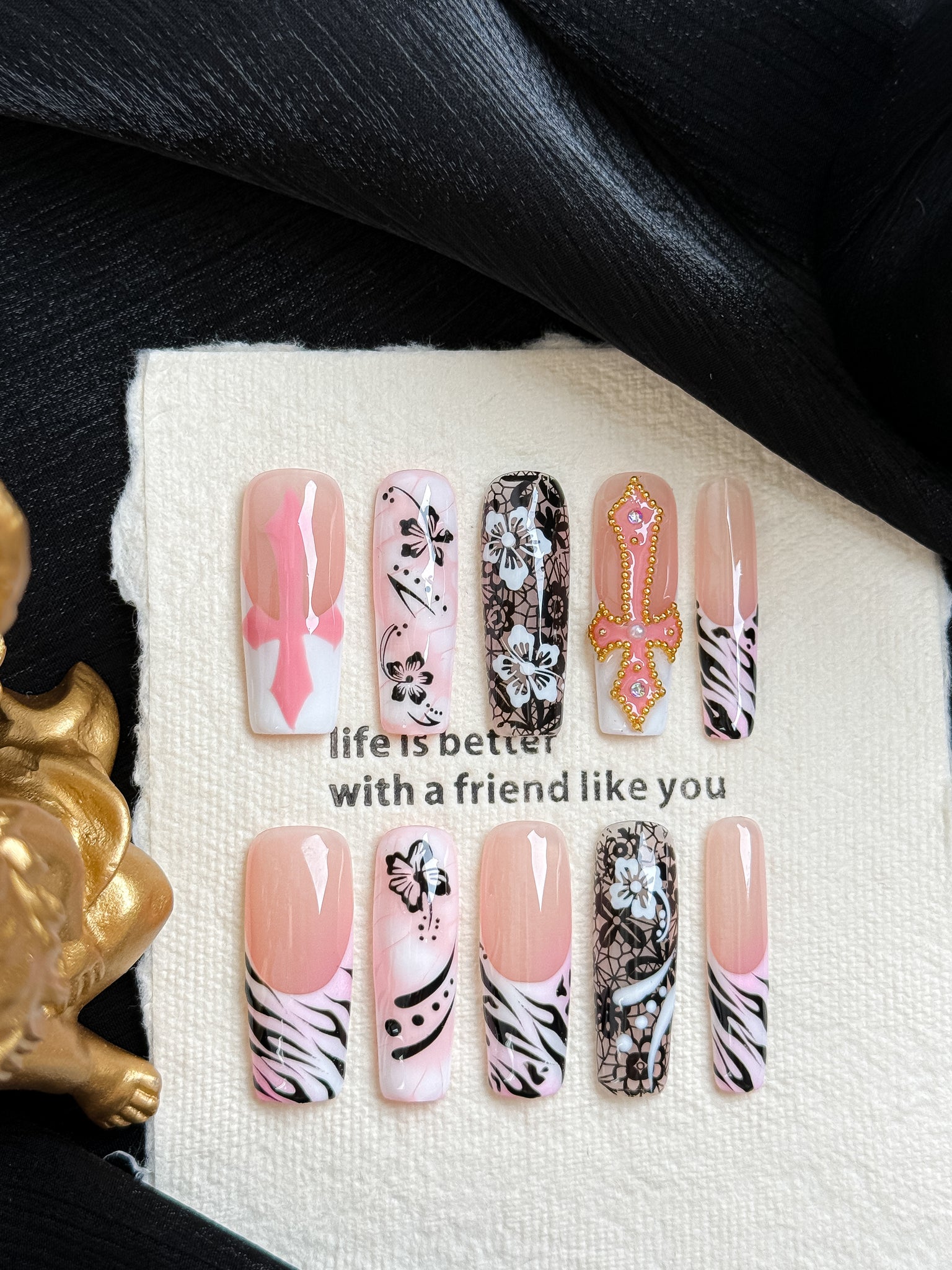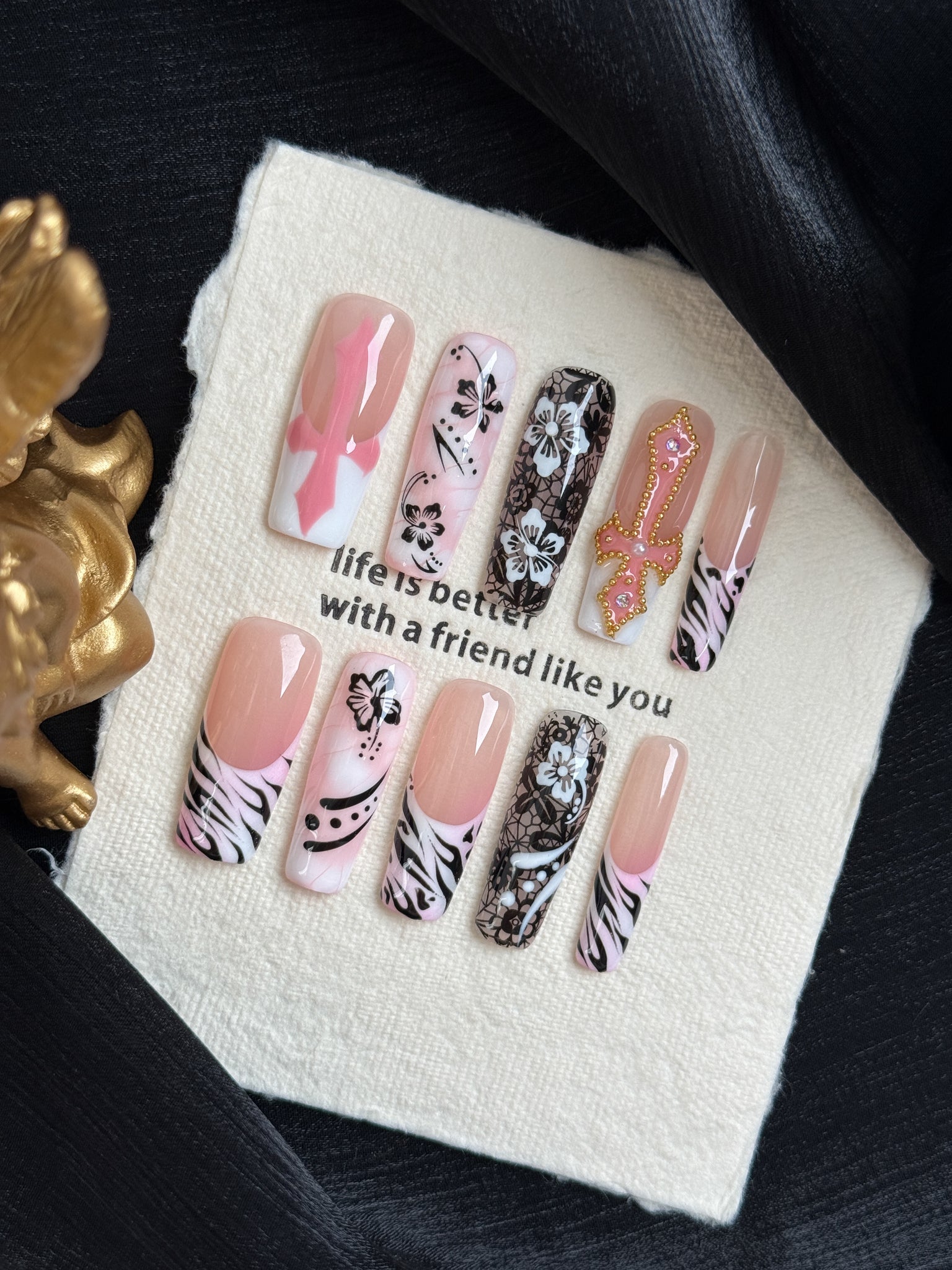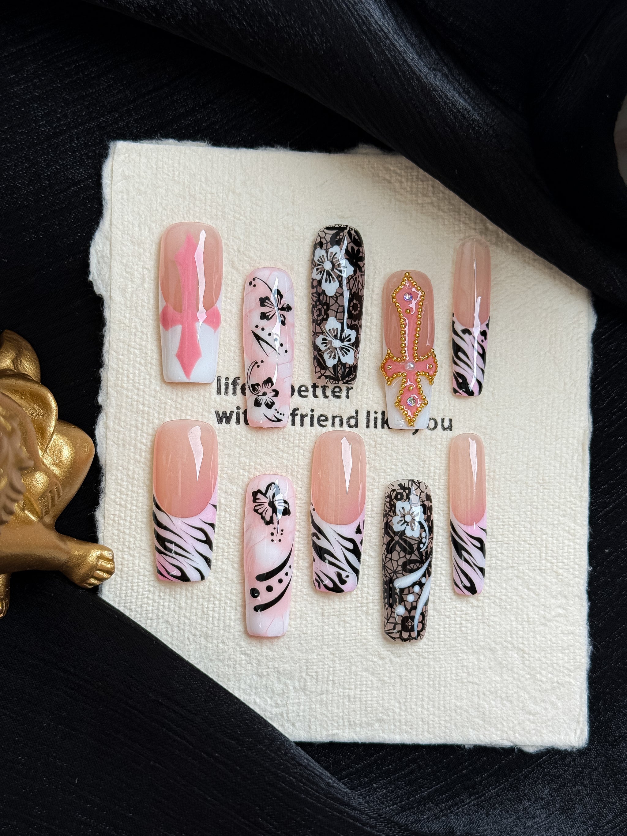Featuring a nude-to-pink gradient base, lace-inspired detailing, zebra accents, and a bold cross centerpiece, this set captures the contrast between delicate femininity and fearless edge.