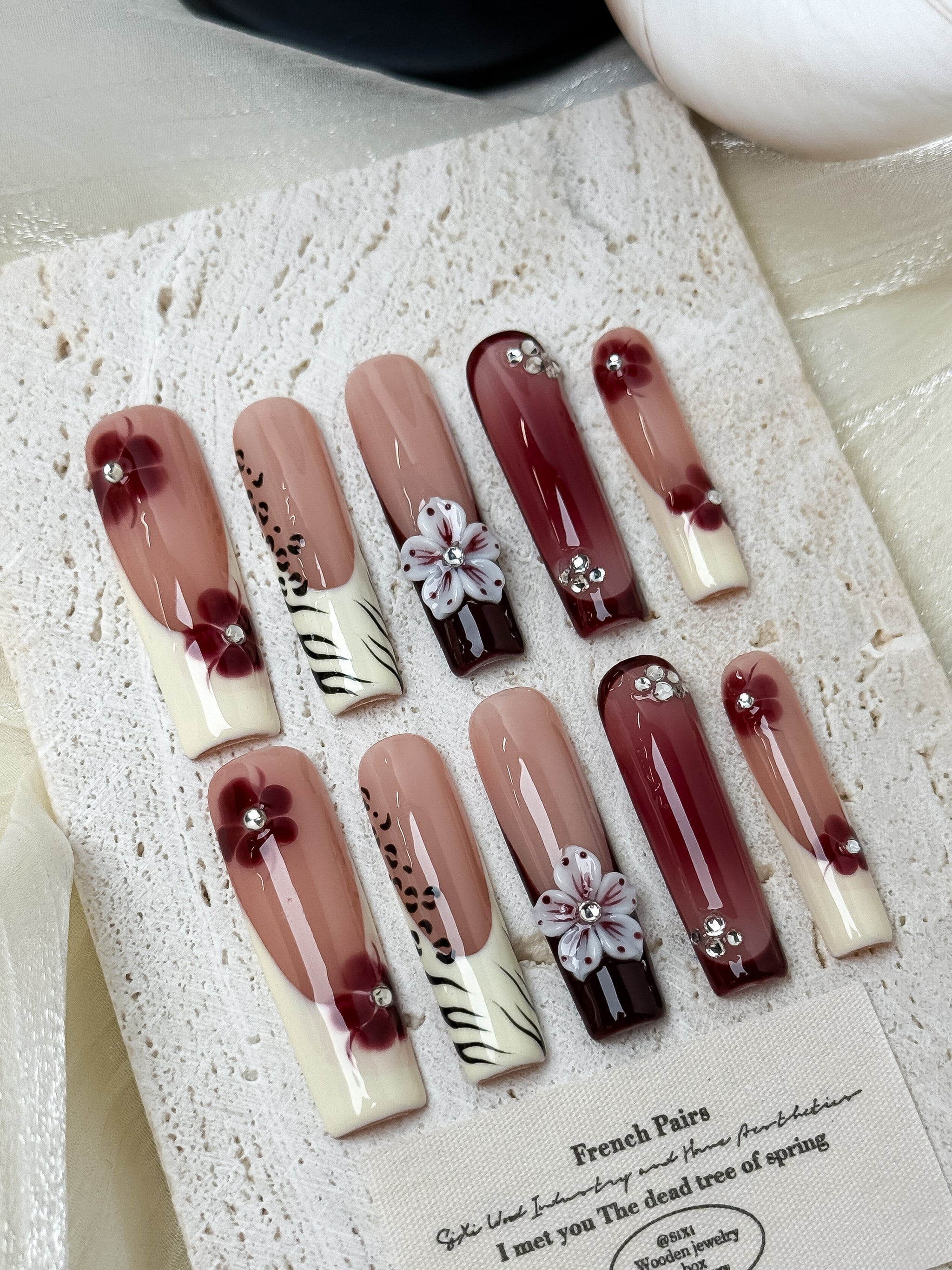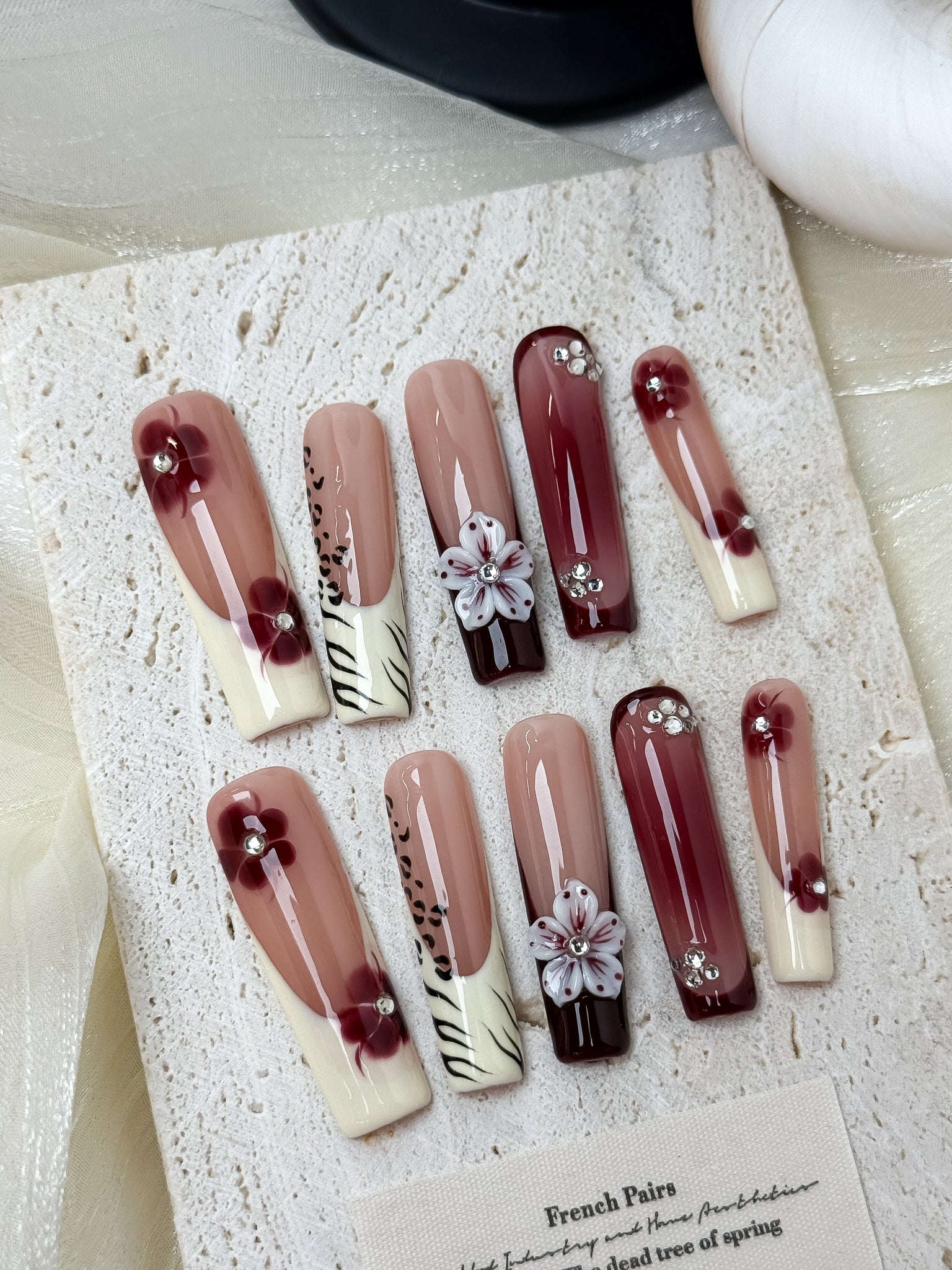 Burgundy Blossom Milk features a creamy nude base paired with deep burgundy accents, hand-painted floral details, and sculpted 3D blossoms.