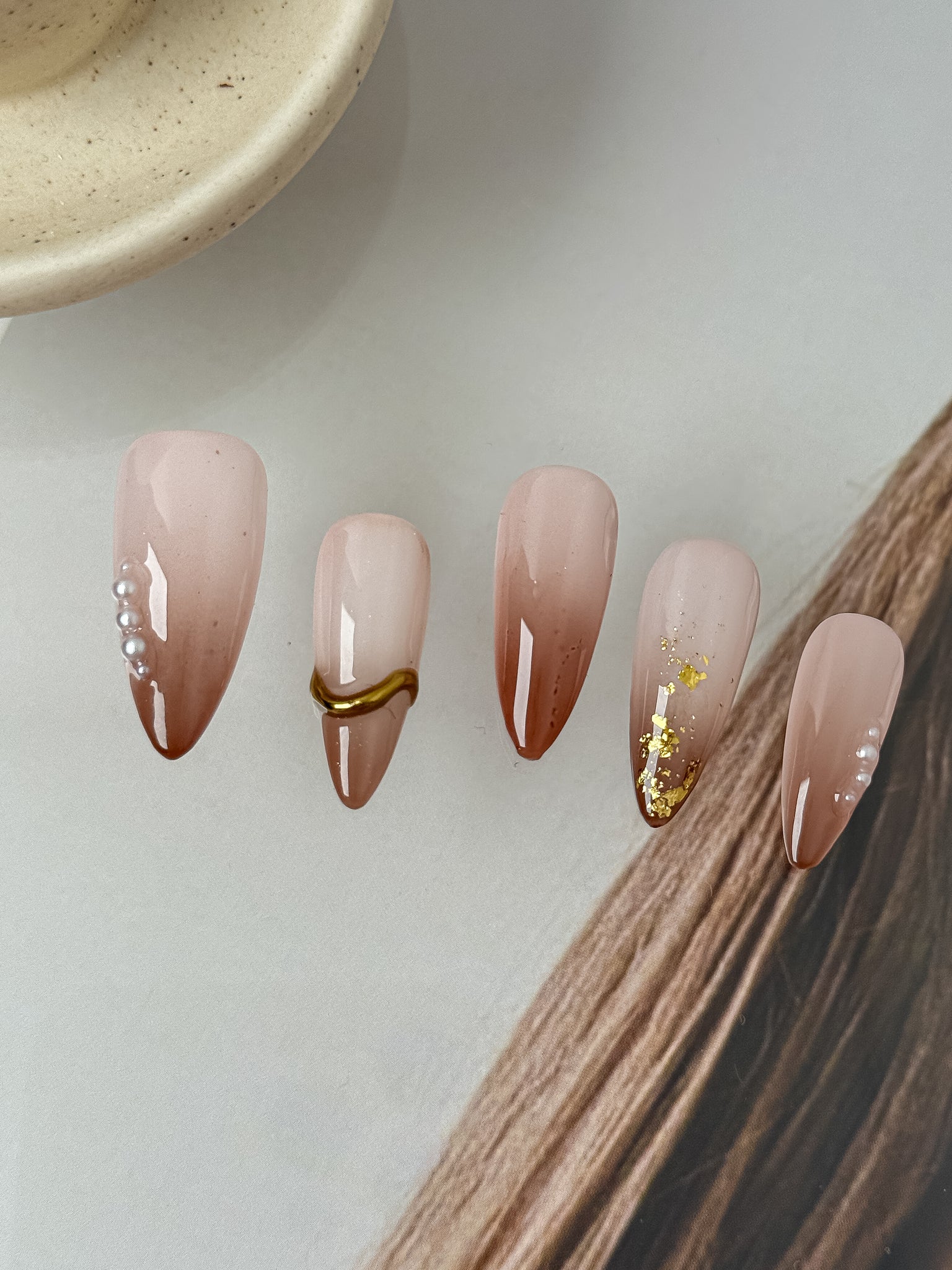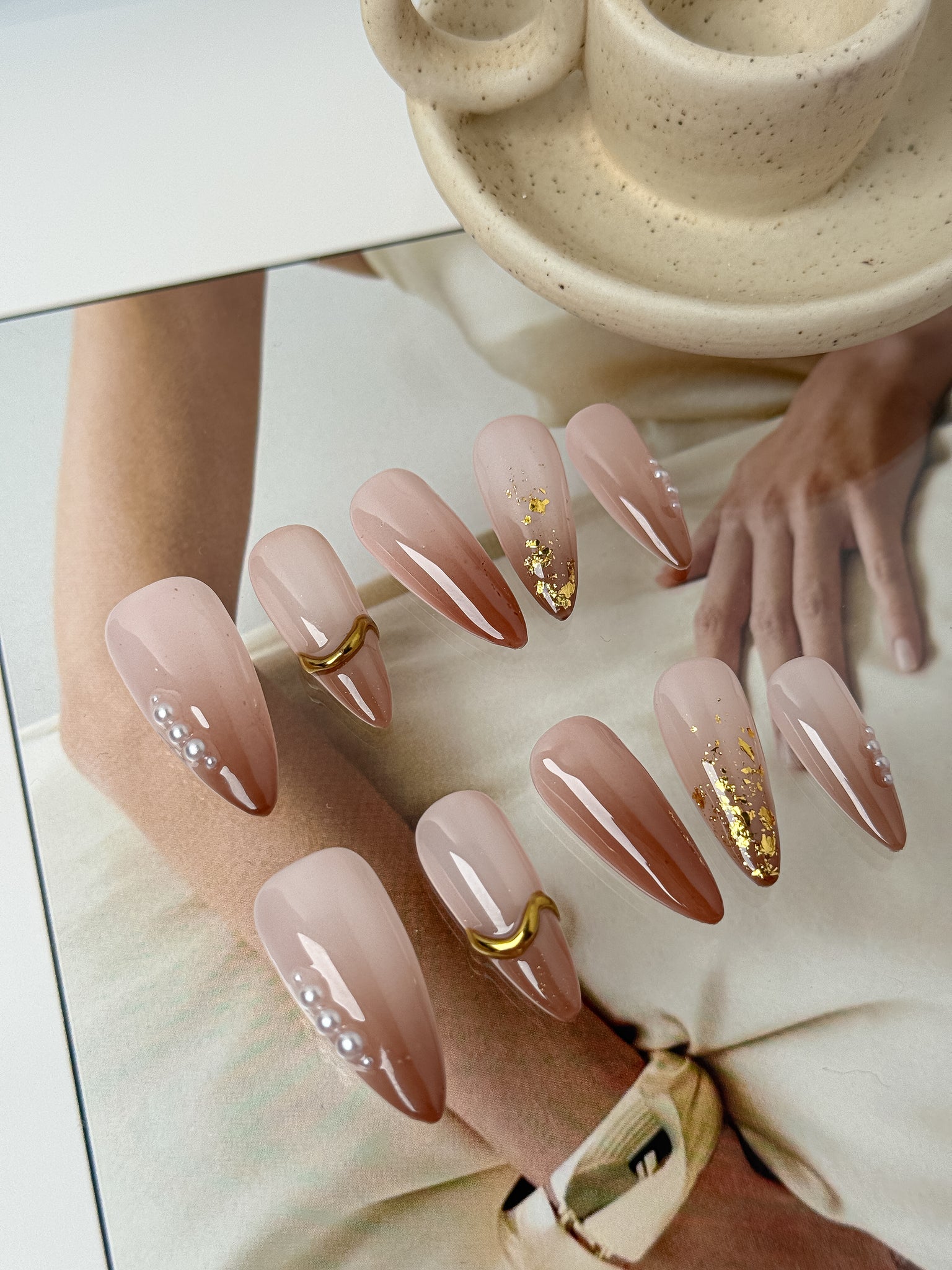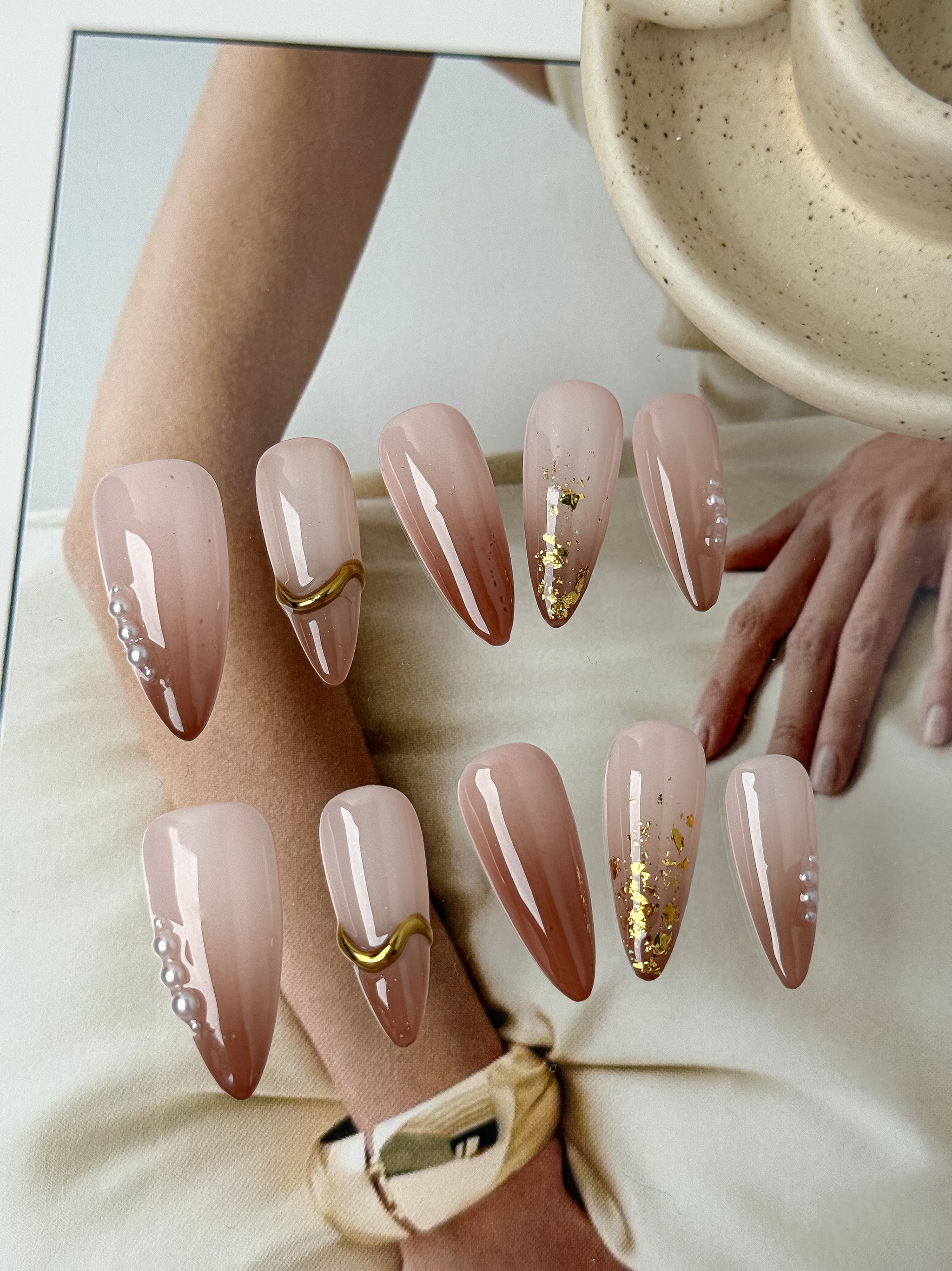 Featuring sheer blush gradients, delicate pearl accents, subtle gold foil, and sculpted metallic details, this set delivers an effortless, refined elegance.