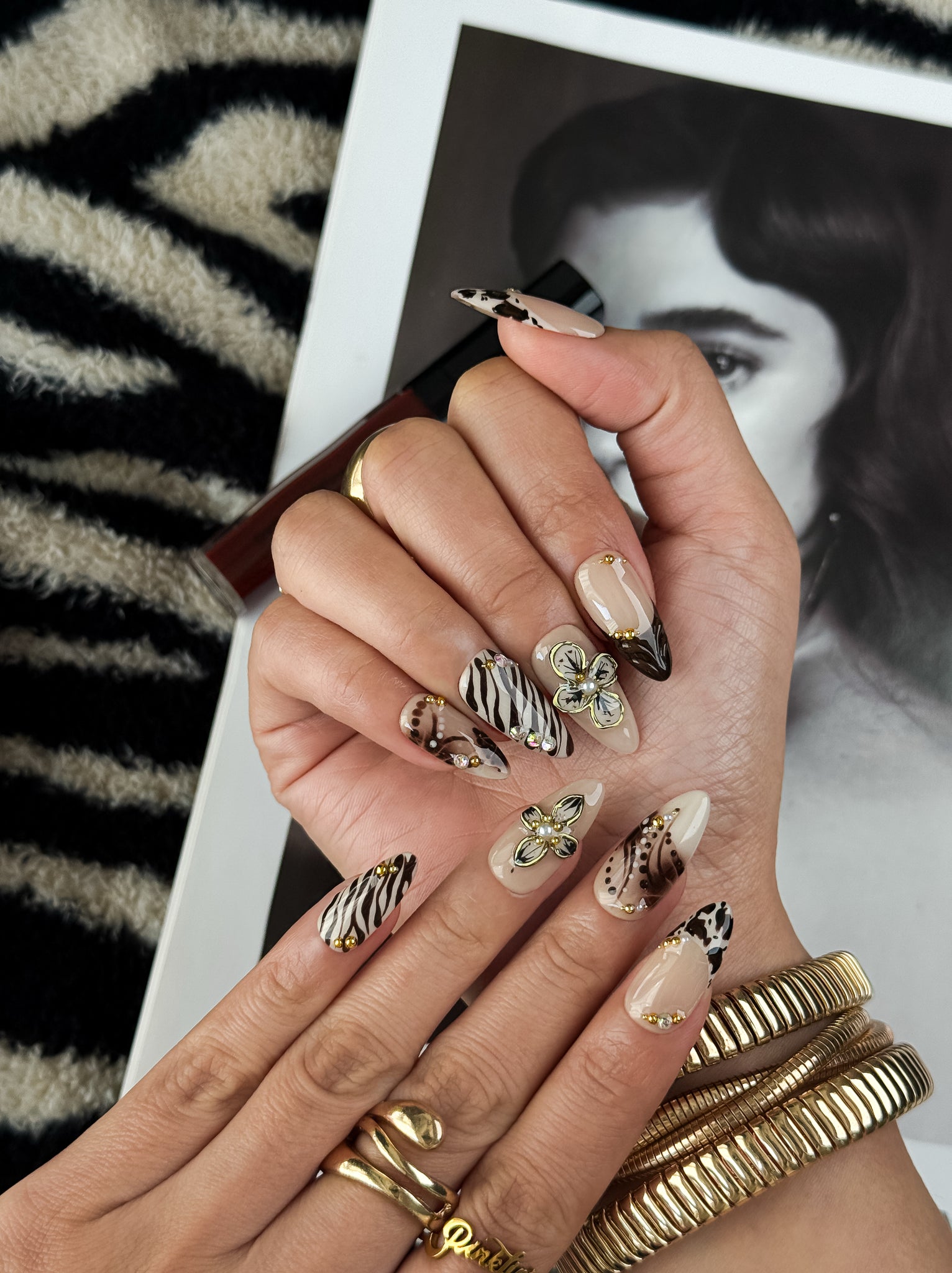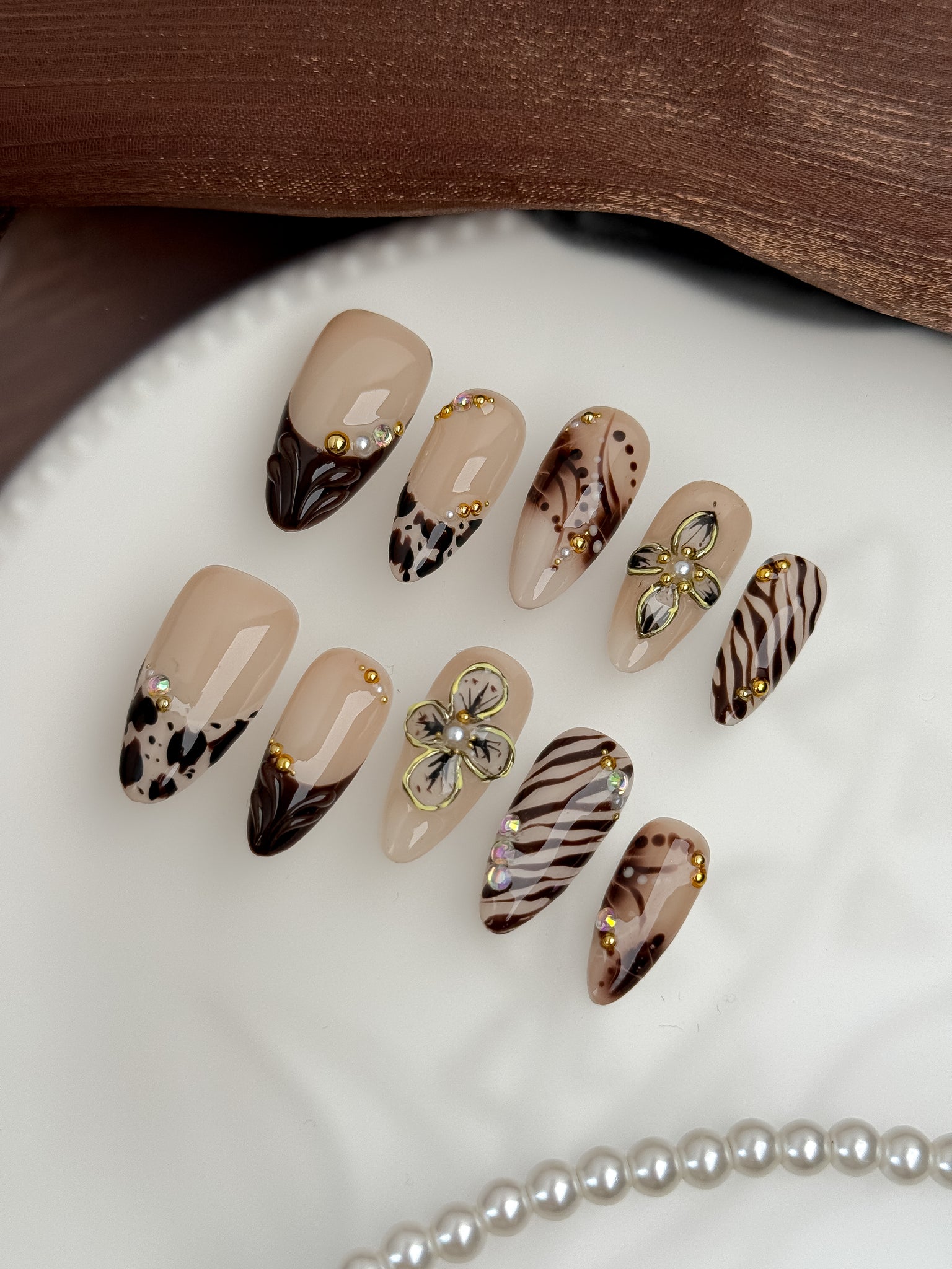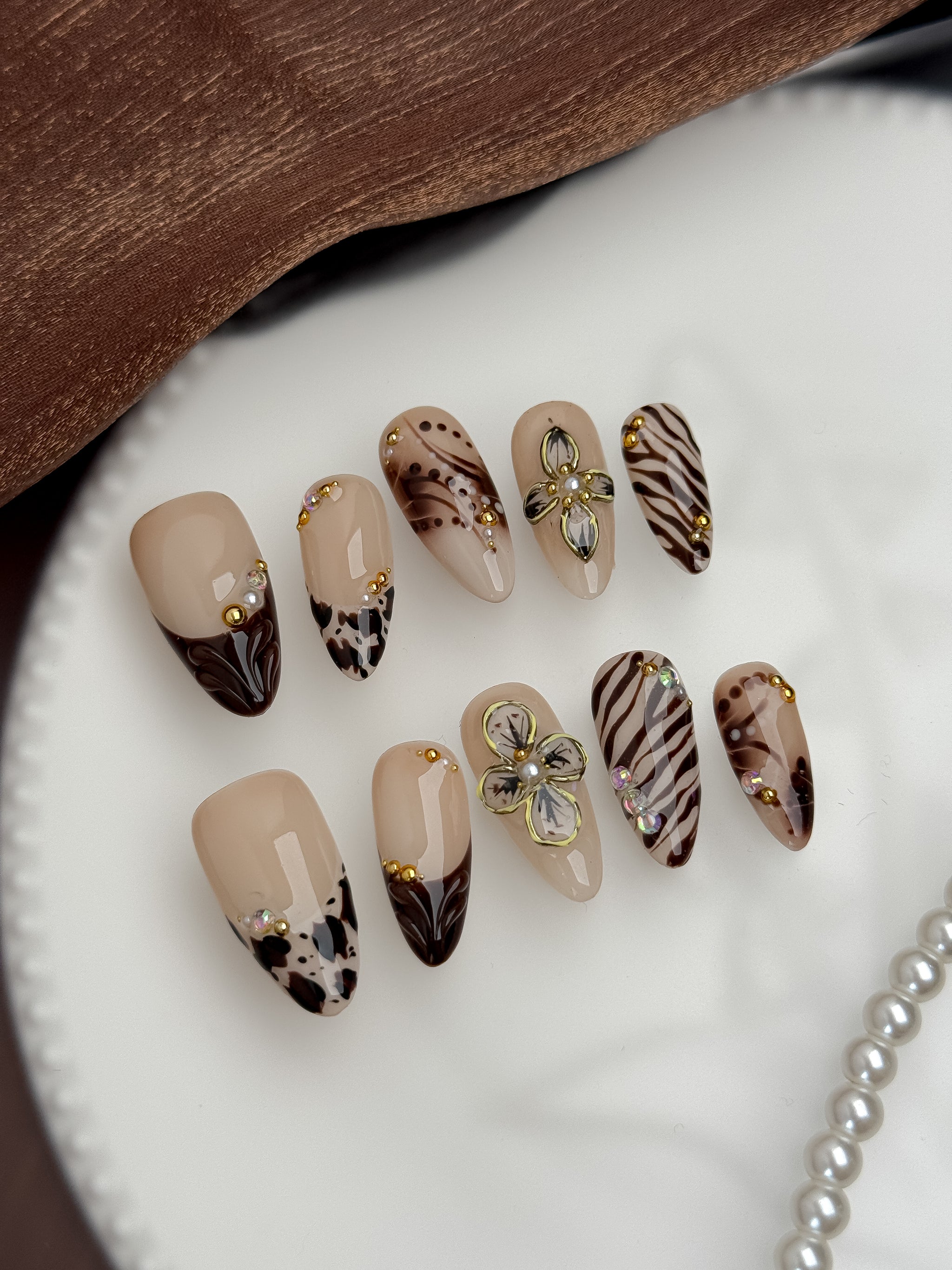 Featuring nude beige bases, chocolate-brown accents, subtle animal patterns, and hand-painted floral elements, this design balances modern chic with everyday wearability. Gentle gold beads and crystal details add a refined glow without overpowering the look.