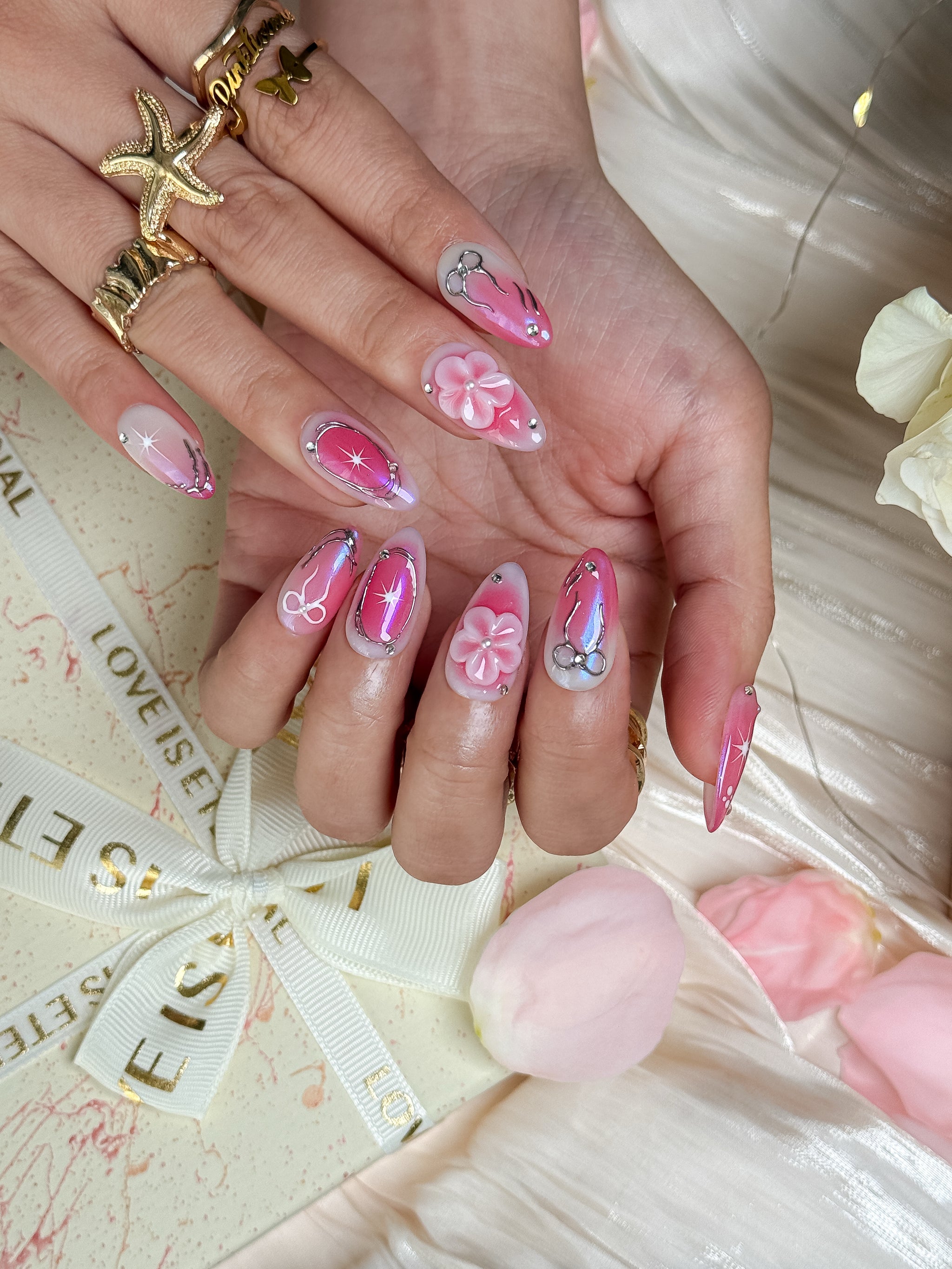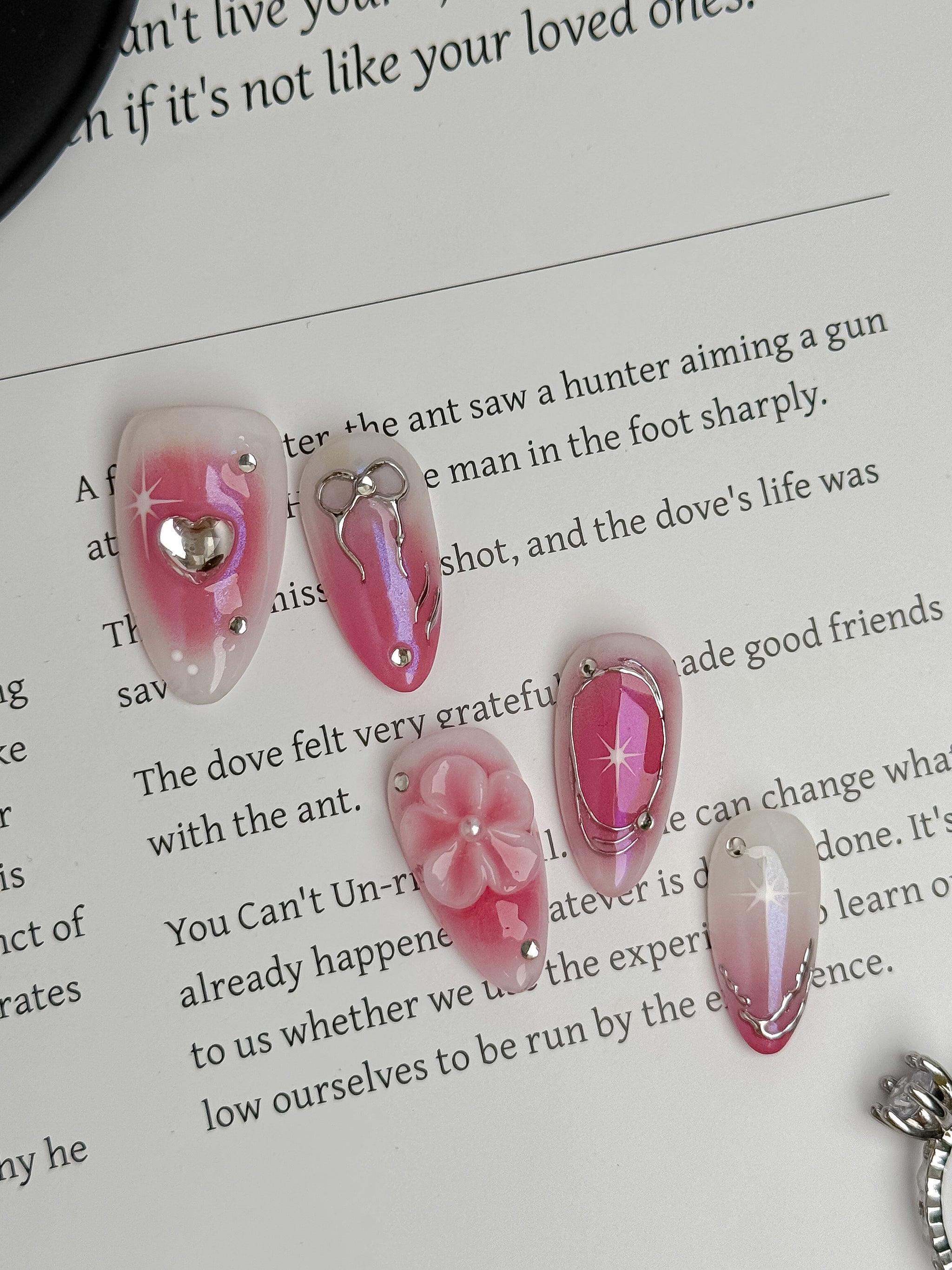 Pink Luminance is a romantic press-on nail set featuring soft pink gradients, pearlescent shine, and delicate floral details.